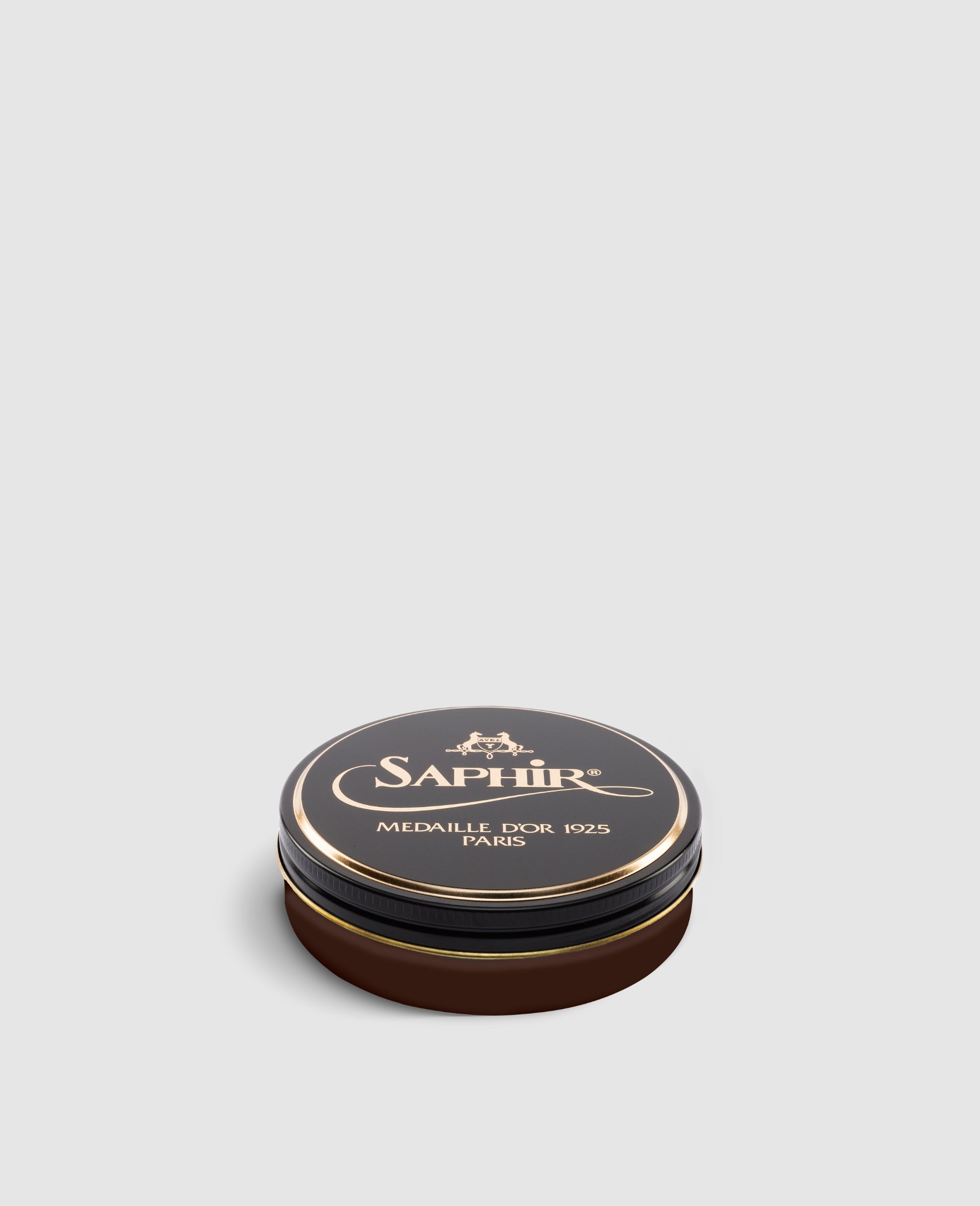 For superior protection for all smooth leather shoes, the French Pate de Luxe shoe wax from Saphir Médaille d'Or is the perfect choice. As a complement to an intensely nourishing treatment, this luxurious shoe wax not only imbues the leather with natural protection, but also creates an intense shine on smooth leather shoes. The wax owes its exceptional properties to its carefully selected ingredients, which include high-quality oils and waxes such as beeswax and carnauba wax along with pine tree turpentine.
