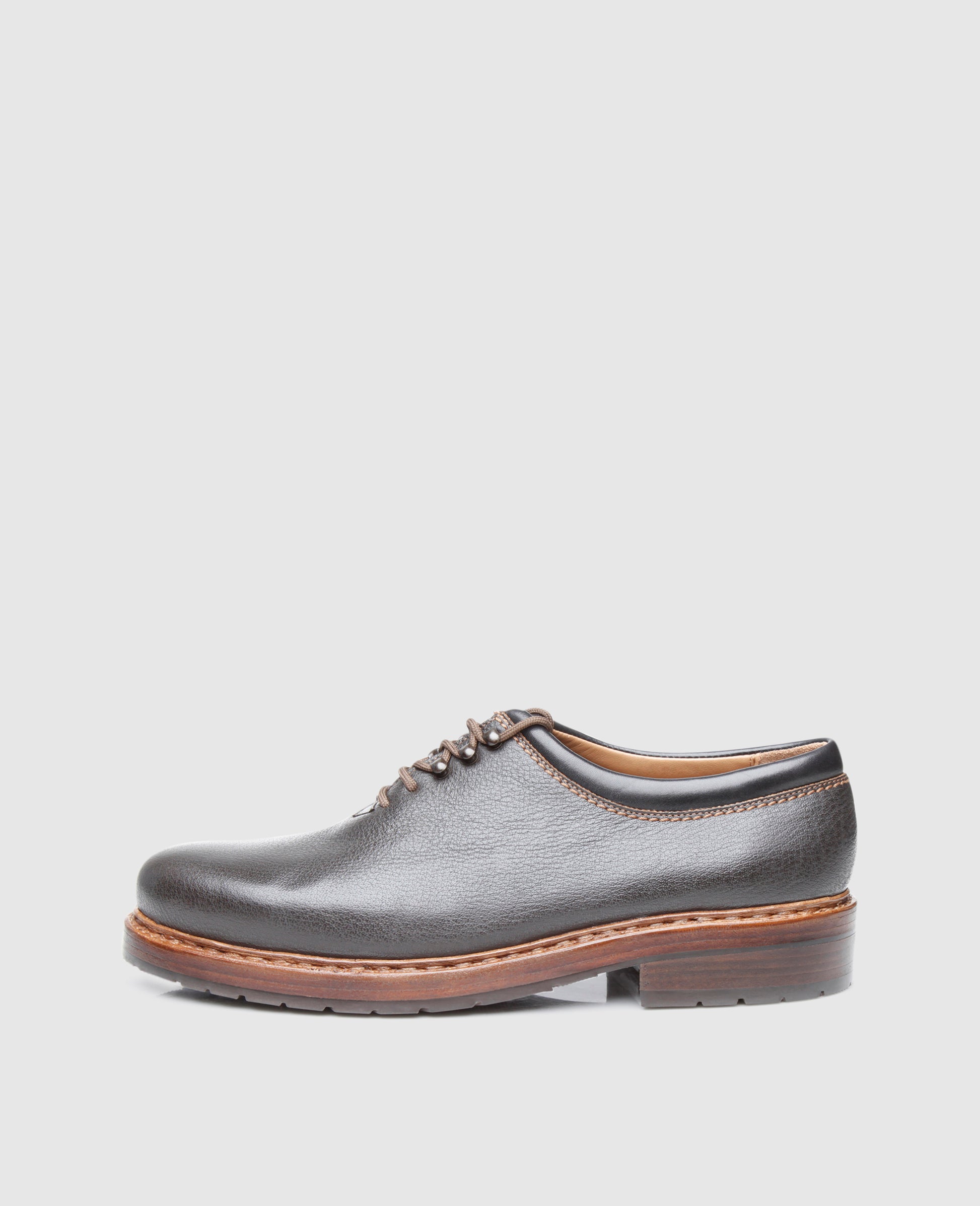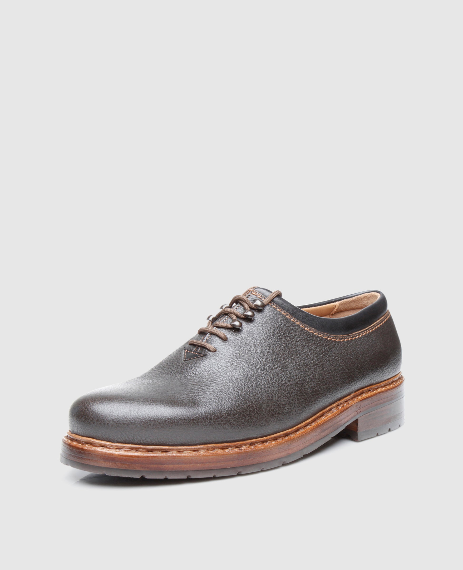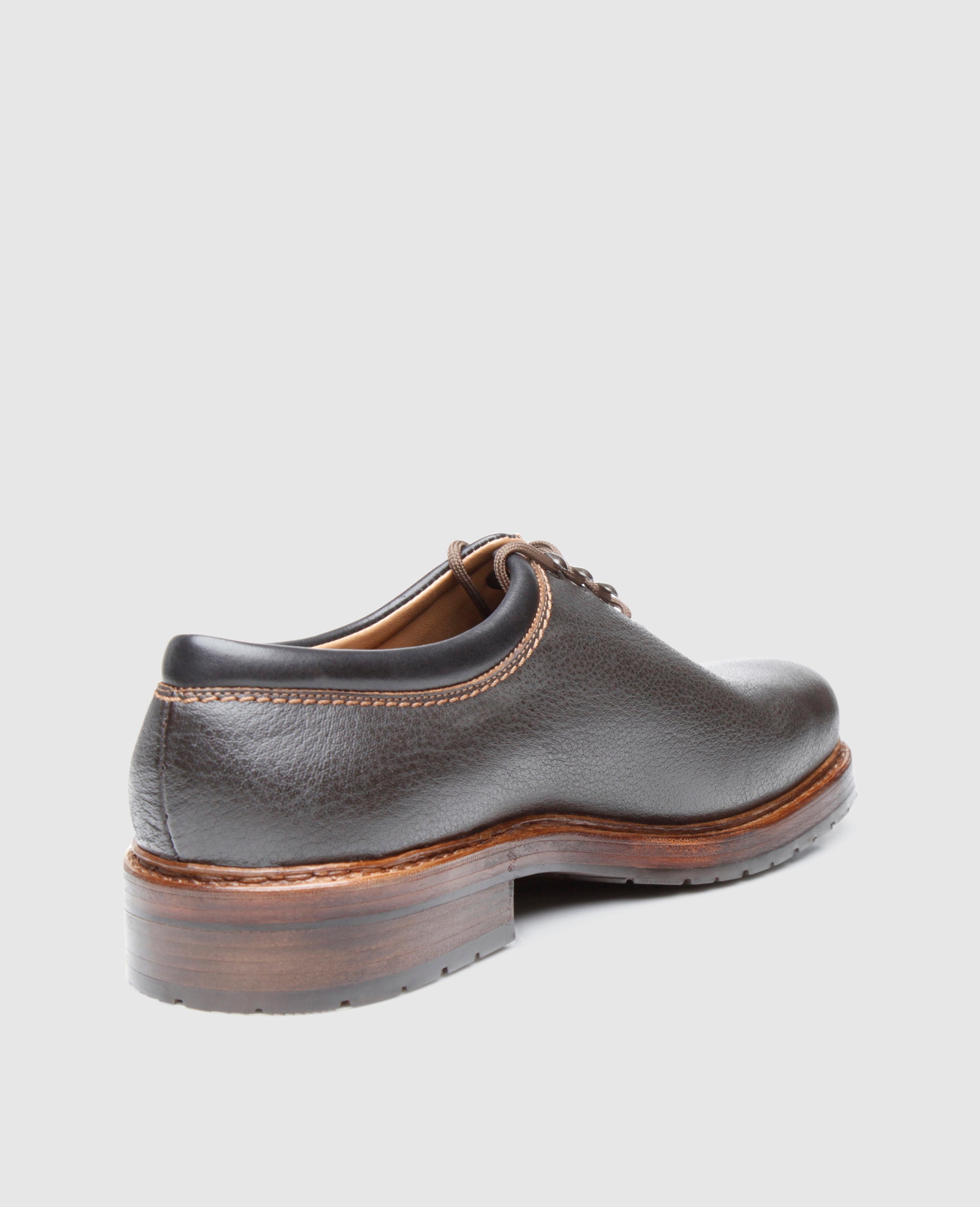The double stitched wholecut consists of soft, durable and extremely supple water buffalo leather. Over time, the exquisite upper develops an alluring patina.The closed lacing boasts a modern arrangement of two eyelets and three hook pairs – a real rarity among the classic lace-up shoes. The classic Rio last and the abrasion-resistant triple outsole with an additional rubber lug profile guarantee exceptional wearing comfort.Made by hand in a factory in Budapest by experienced master shoemakers, the black-brown Wholecut exudes a sporty charm in this modern interpretation.
