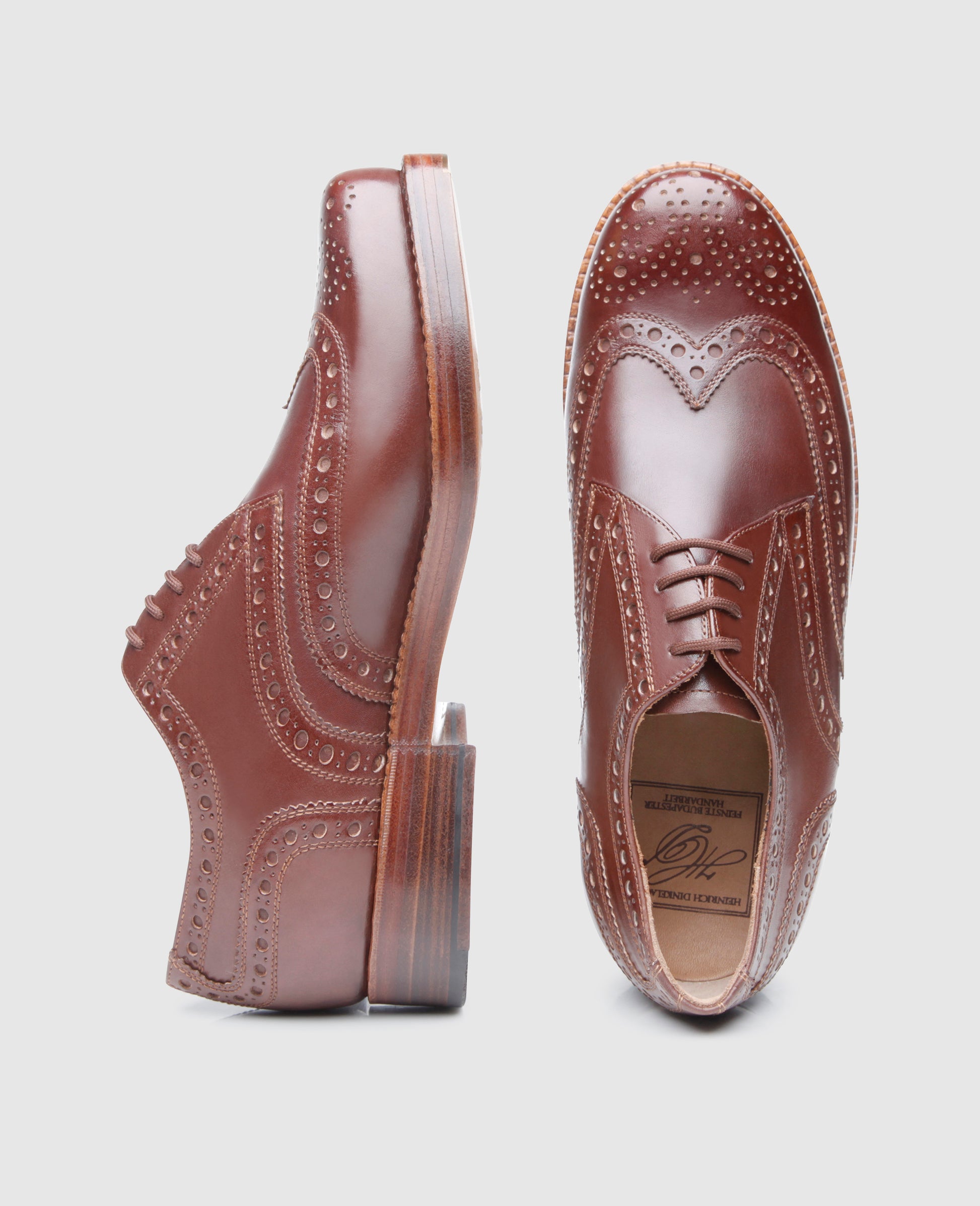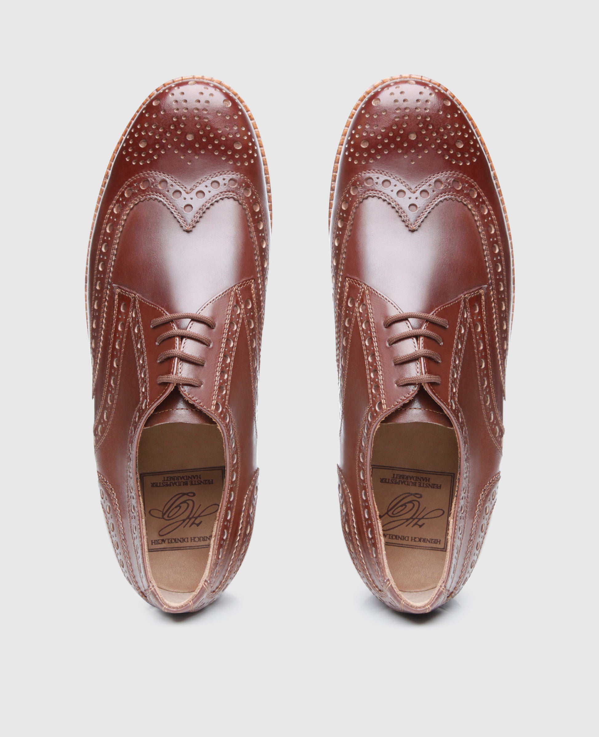 The handcrafted, sewn-welted full-brogue Derby with open four-eyelet lacing boasts the famous triple leather outsole along with six elaborate brass nails and fittings at the tip of the outsole. This dynamic men’s shoe is revered worldwide for its opulent ornamental perforation along the seams, as well as the perforated wingtips and heel cap.The full-brogue Derby is available in dark brown, nut brown and tobacco.Master shoemakers treat the aniline-dyed calfskin with an elaborate polish at the Heinrich Dinkelacker Factory, which makes for a unique shoe with an elegant patina. In short, the perfect companion for business and leisure.