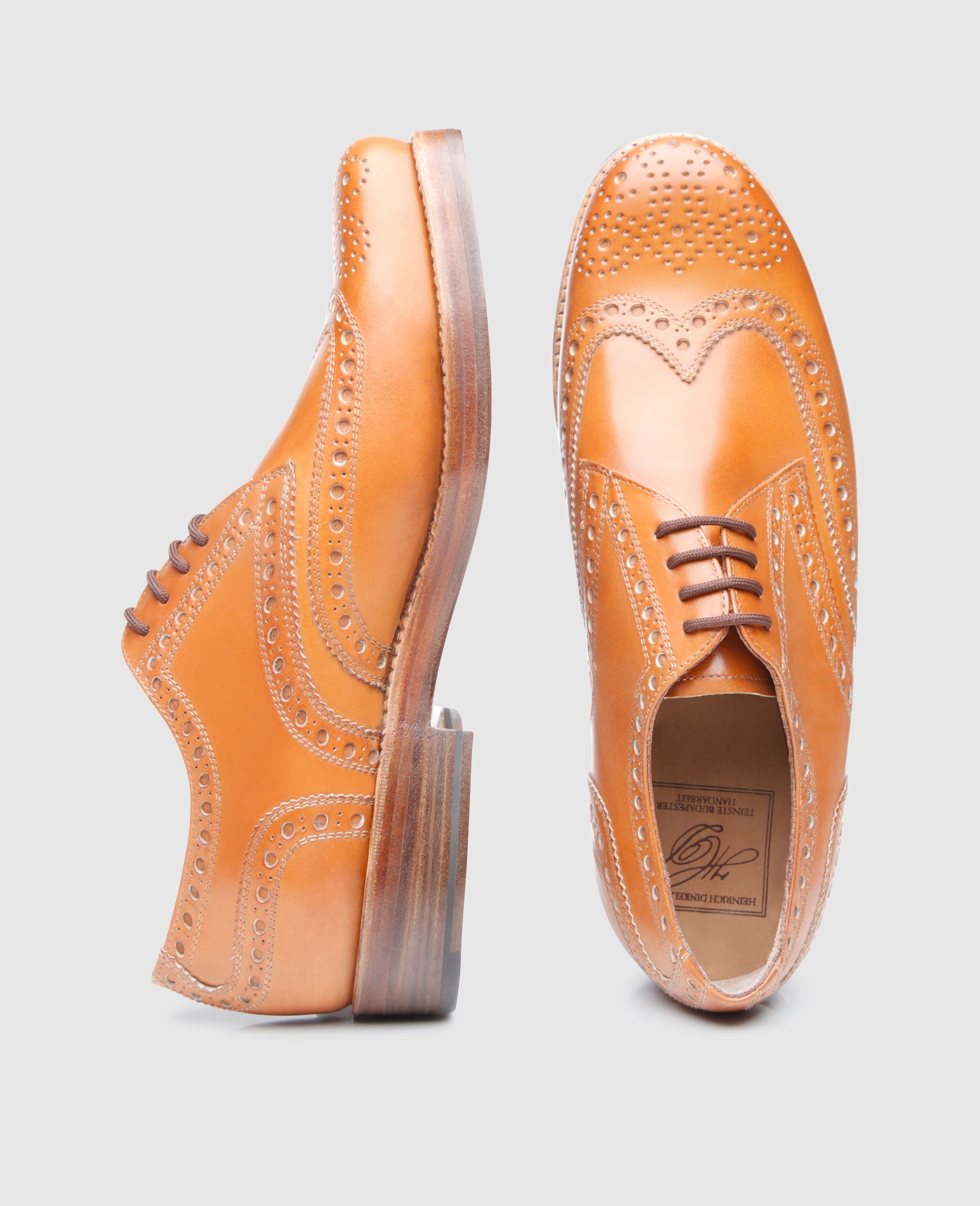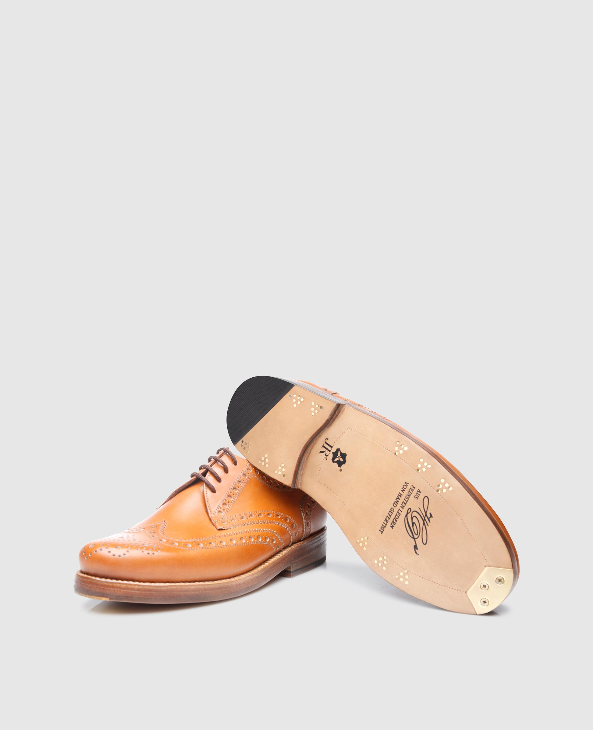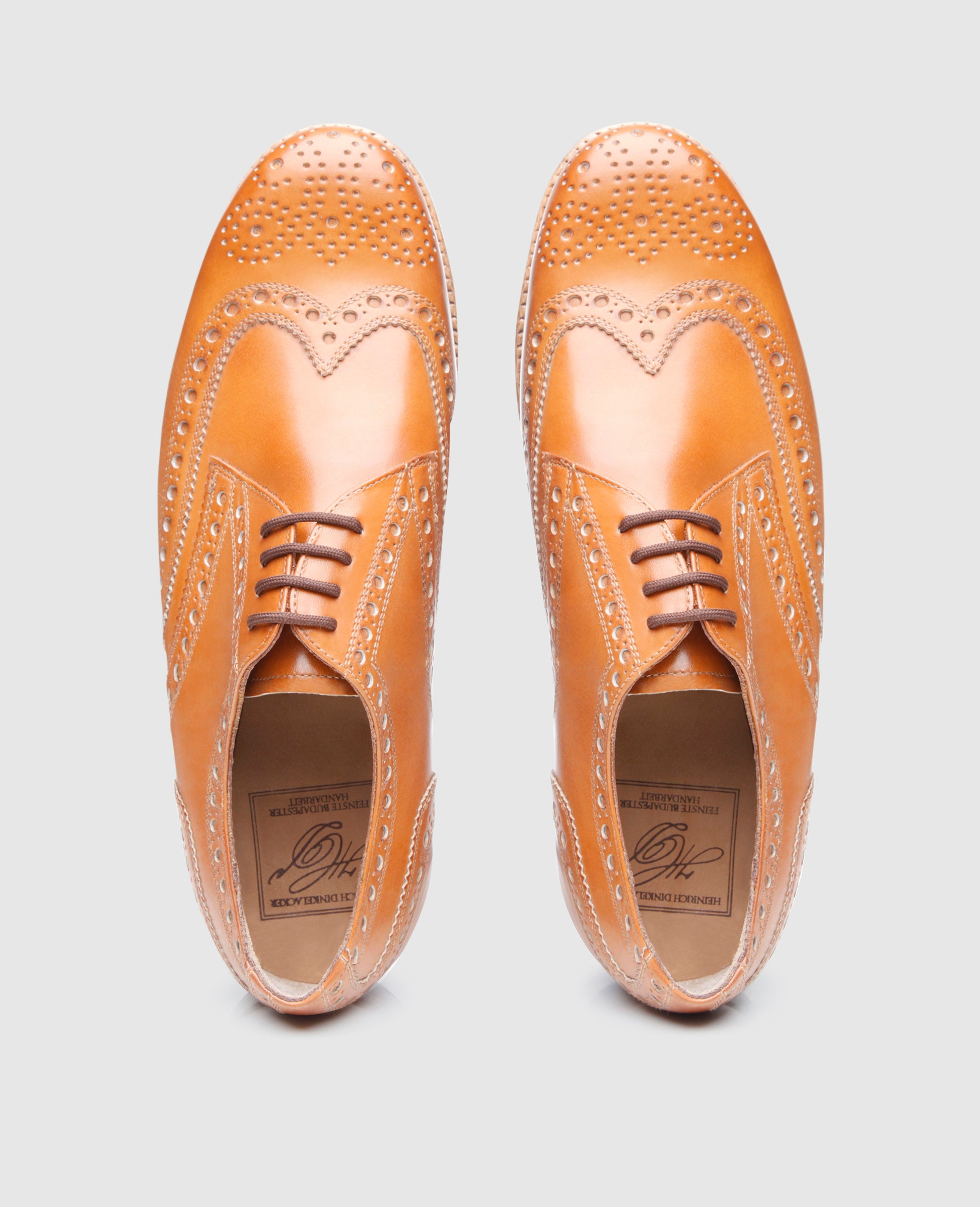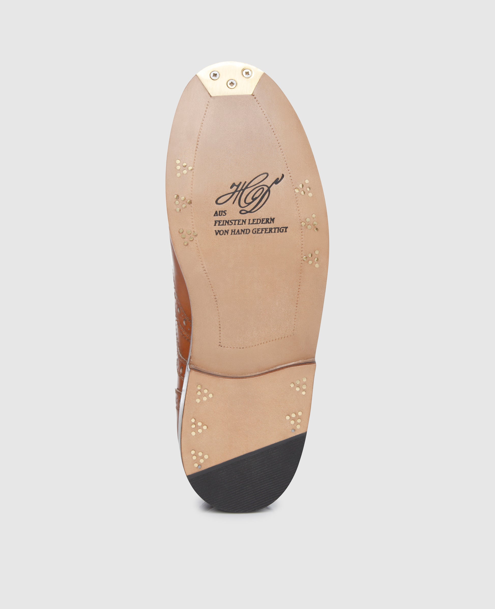 The handcrafted, sewn-welted full-brogue Derby with open four-eyelet lacing boasts the famous triple leather outsole along with six elaborate brass nails and fittings at the tip of the outsole. This dynamic men’s shoe is revered worldwide for its opulent ornamental perforation along the seams, as well as the perforated wingtips and heel cap.Master shoemakers treat the aniline-dyed calfskin with an elaborate polish at the Heinrich Dinkelacker Factory, which makes for a unique shoe with an elegant patina. In short, the perfect companion for business and leisure.The full-brogue Derby is available in dark brown, nut brown and tobacco.