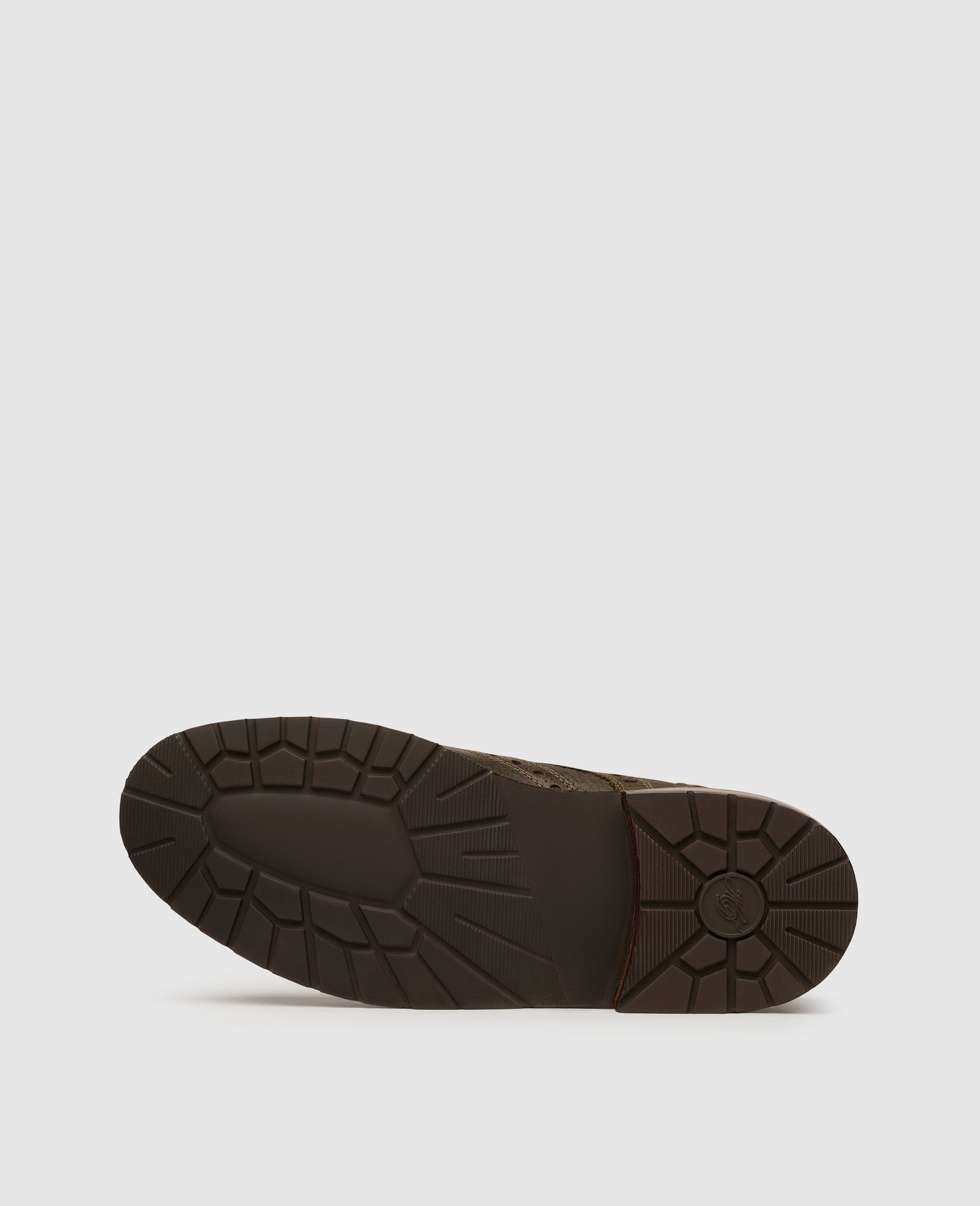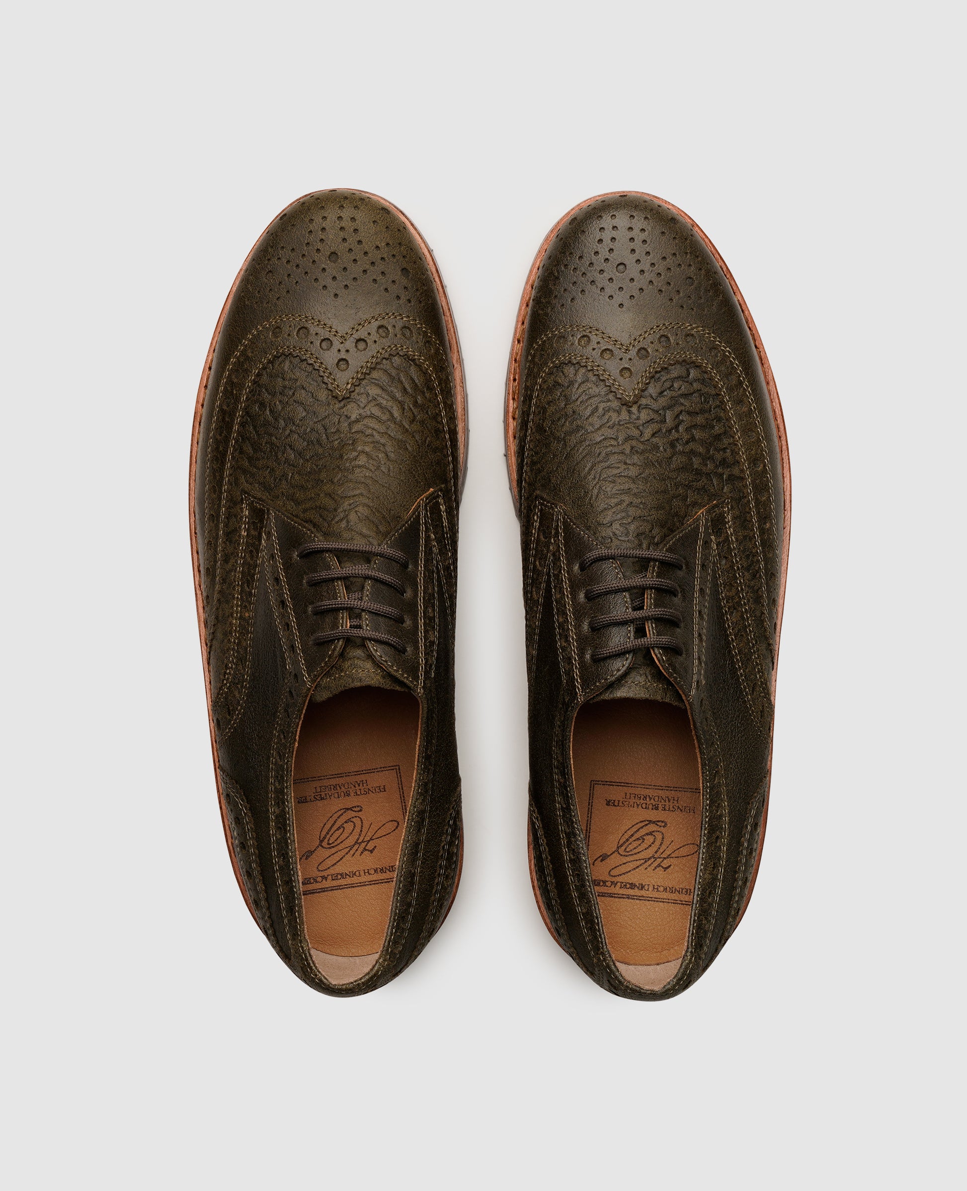 Opulent detailing and embossed, greased nubuck leather lend this double-stitched and handcrafted full-brogue Derby a deliberate nonchalance. The intricate lyra perforations along the edges of the upper and curved toe and heel caps once again testify to the detailed craftsmanship produced by Heinrich Dinkelacker. Originally used by rural communities in the Irish and Scottish Highlands to dry their drenched shoes more quickly, they are now purely for adornment and today exude a sense of luxury.