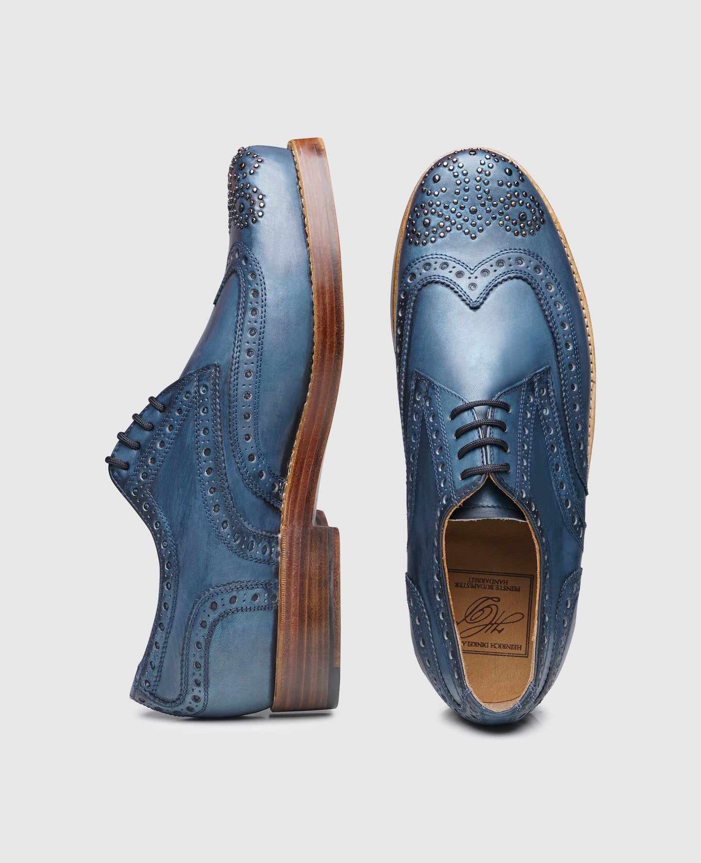 This traditional ‘Budapester’ design is completely reinterpreted with the combination of leather and decorative embellishment found in this model. The classic Budapester last, the Rio, and the characteristic Lyra perforations on the upper take on a new form with the Rio Full-Brogue A. Featuring a Rendenbach leather sole and reinforced with a hand-screwed brass toe tap.