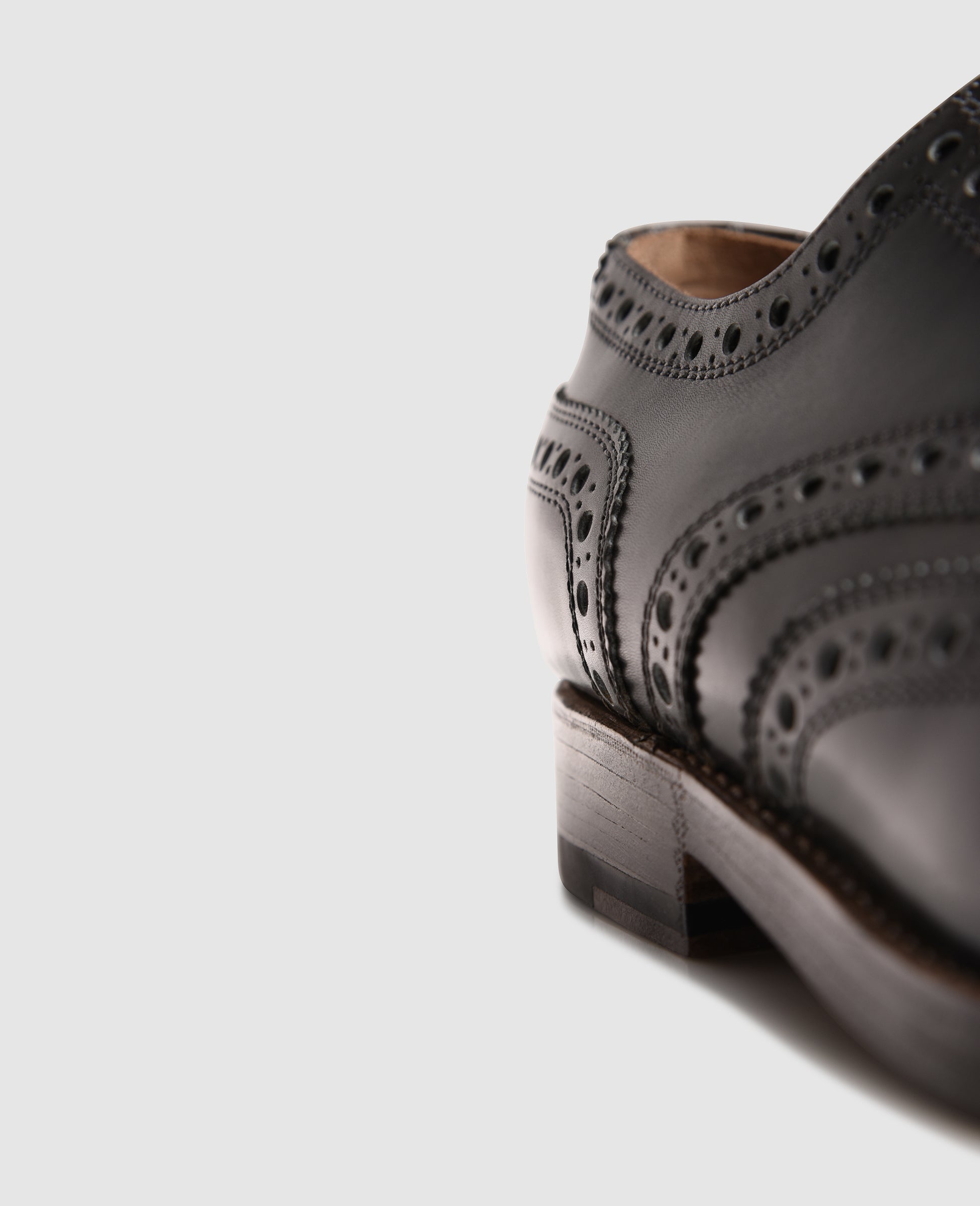 A classic in men's shoe fashion, the full-brogue Derby is given a unique look thanks to its fine Tuscan Calf. The elaborately-brushed hand finish of the soft smooth leather creates an almost 'cloudy' look that is a real eye-catcher.Manufactured on the slender Zürich last, this Goodyear-welted model is a testimony to master craftsmanship and is a faithful companion especially designed for men with a narrower forefoot. The fine double sole is made of exquisite Rendenbach leather and is additionally supported by a set of 3 nails at the toe and heel.
