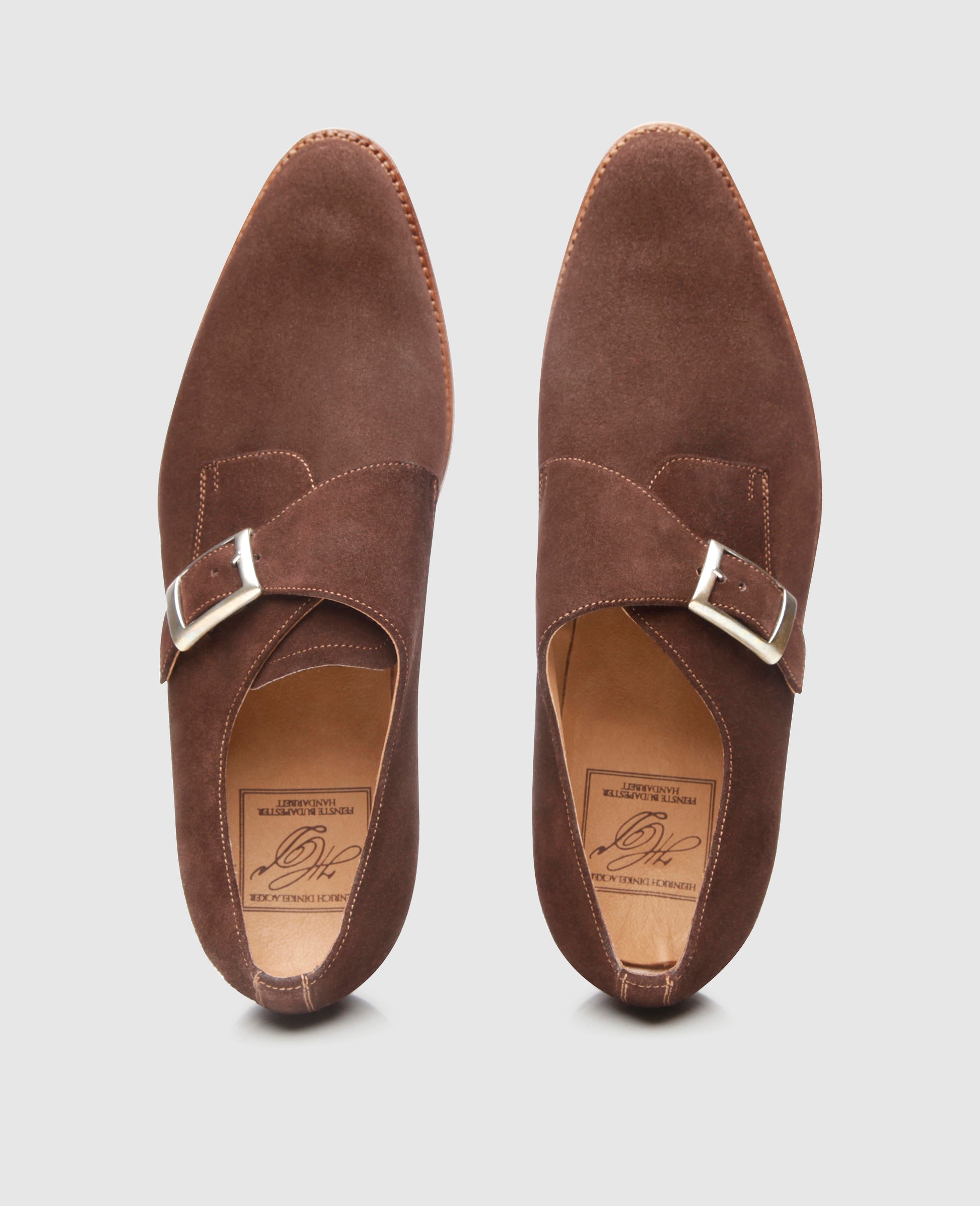 Monk strap for men in supple calf velours handcrafted in Budapest. The characteristic closure buckle is both practical and decorative.
