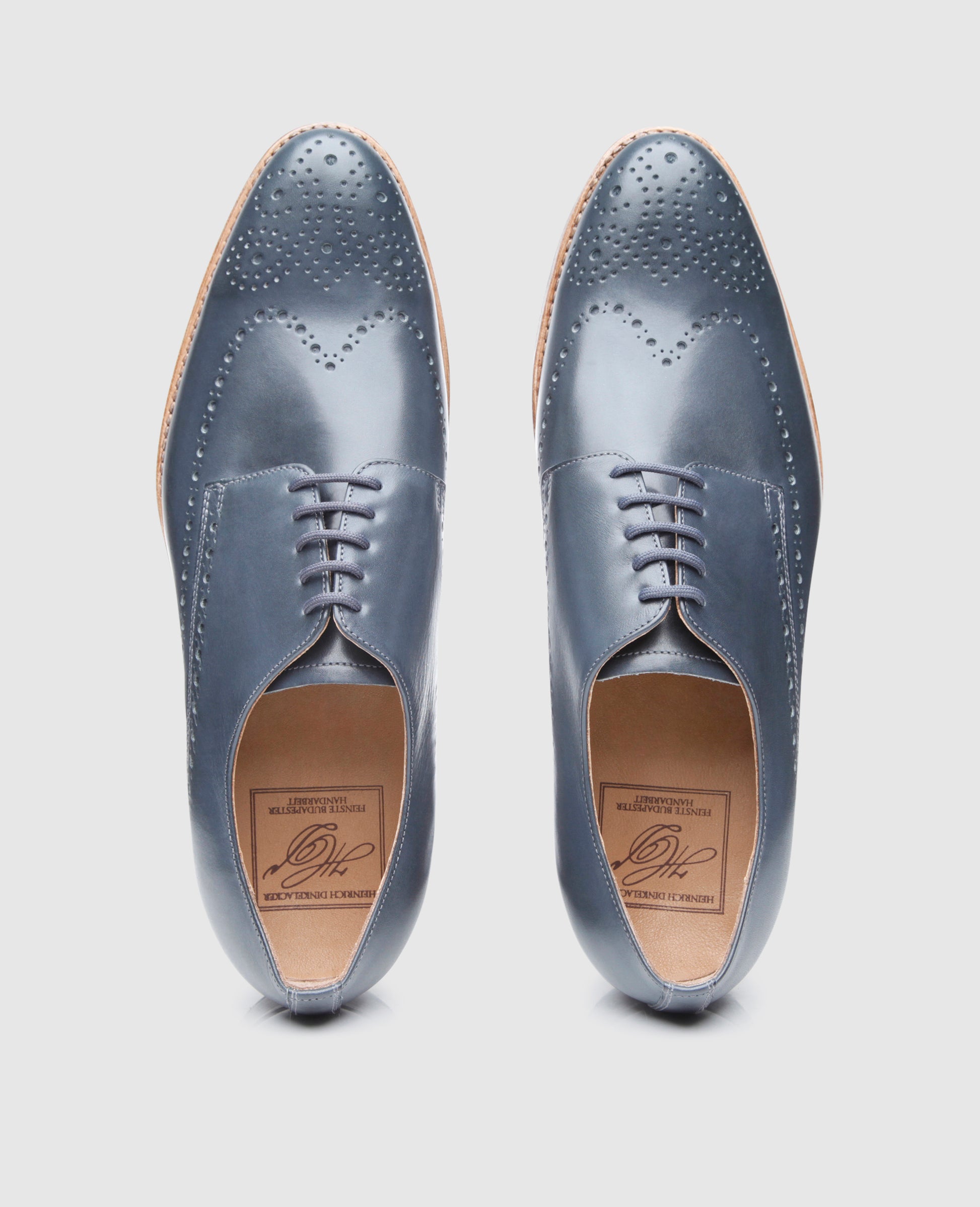 With the handcrafted and welted full-brogue derby with open 5-hole lacing, men are expanding their repertoire with a fashionably elegant companion for leisure and modern business.The popular classic shoe features opulent lyra perforations along the edges of the upper and an attractive ornamentation on the toe. The elegant Paris last shape is pleasantly narrow at the forefoot and is suitable for the average foot, while the shoe upper is made of the finest calfskin, which develops an elegant patina over time, and the hard-wearing triple sole stands out beautifully against the dark upper thanks to the light colouring. The outsole also features a detailed 6-point stainless steel nail pattern.