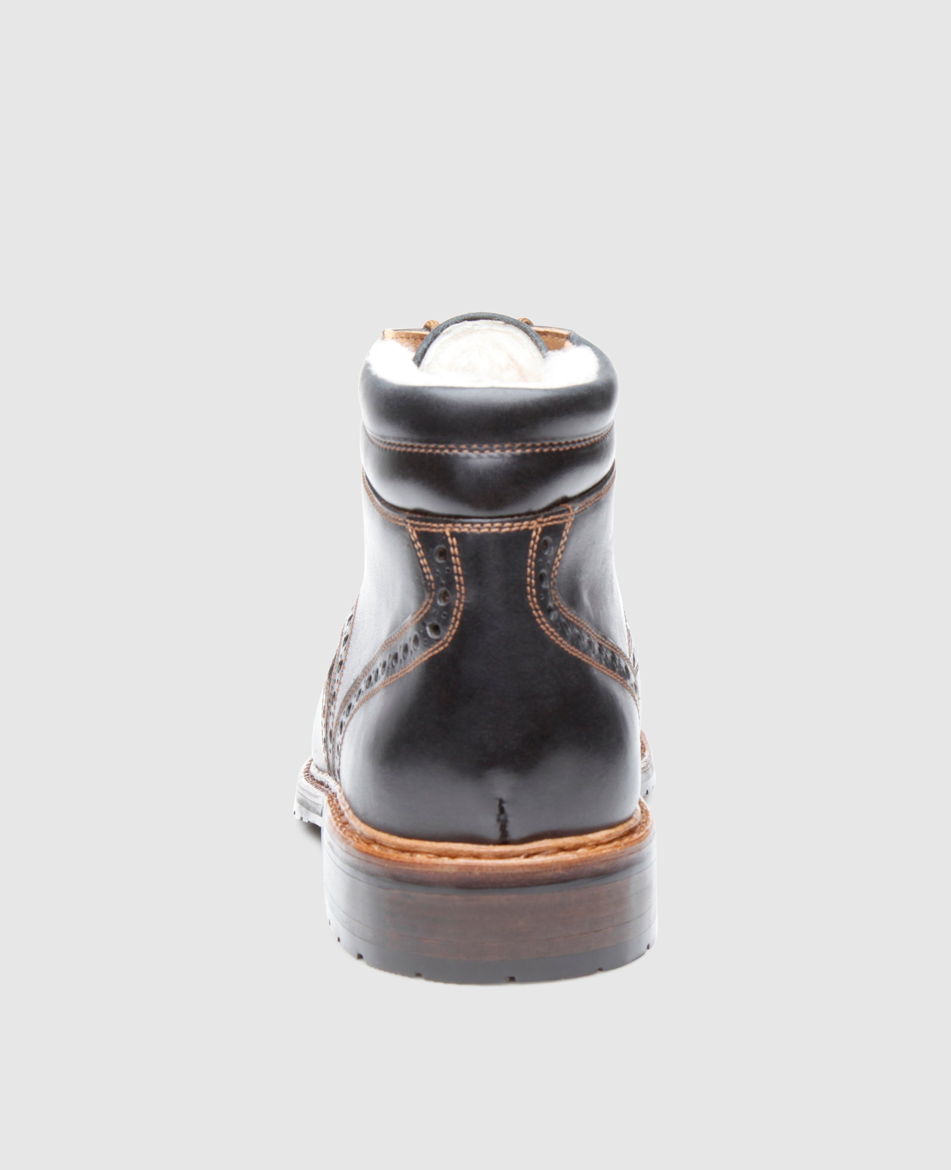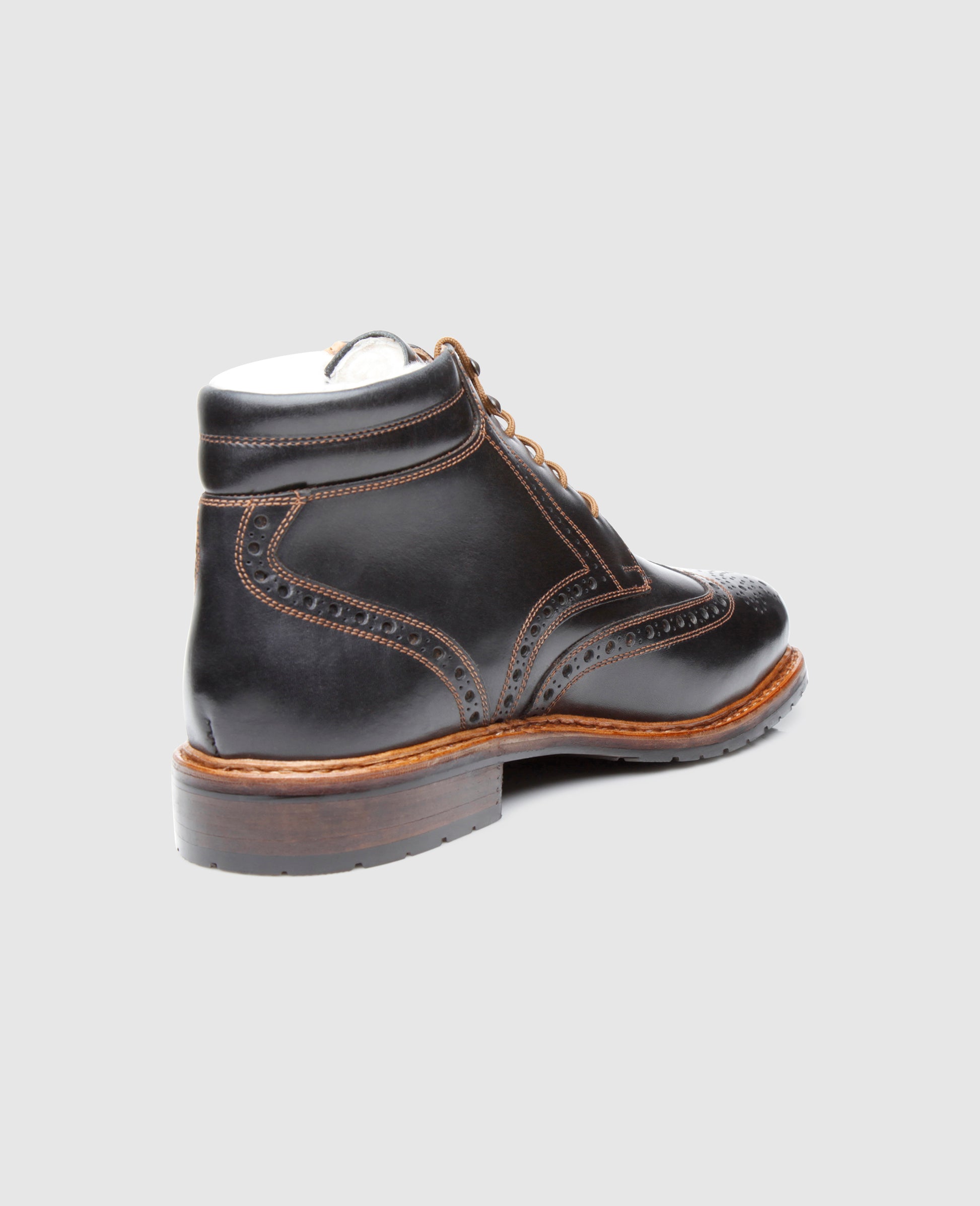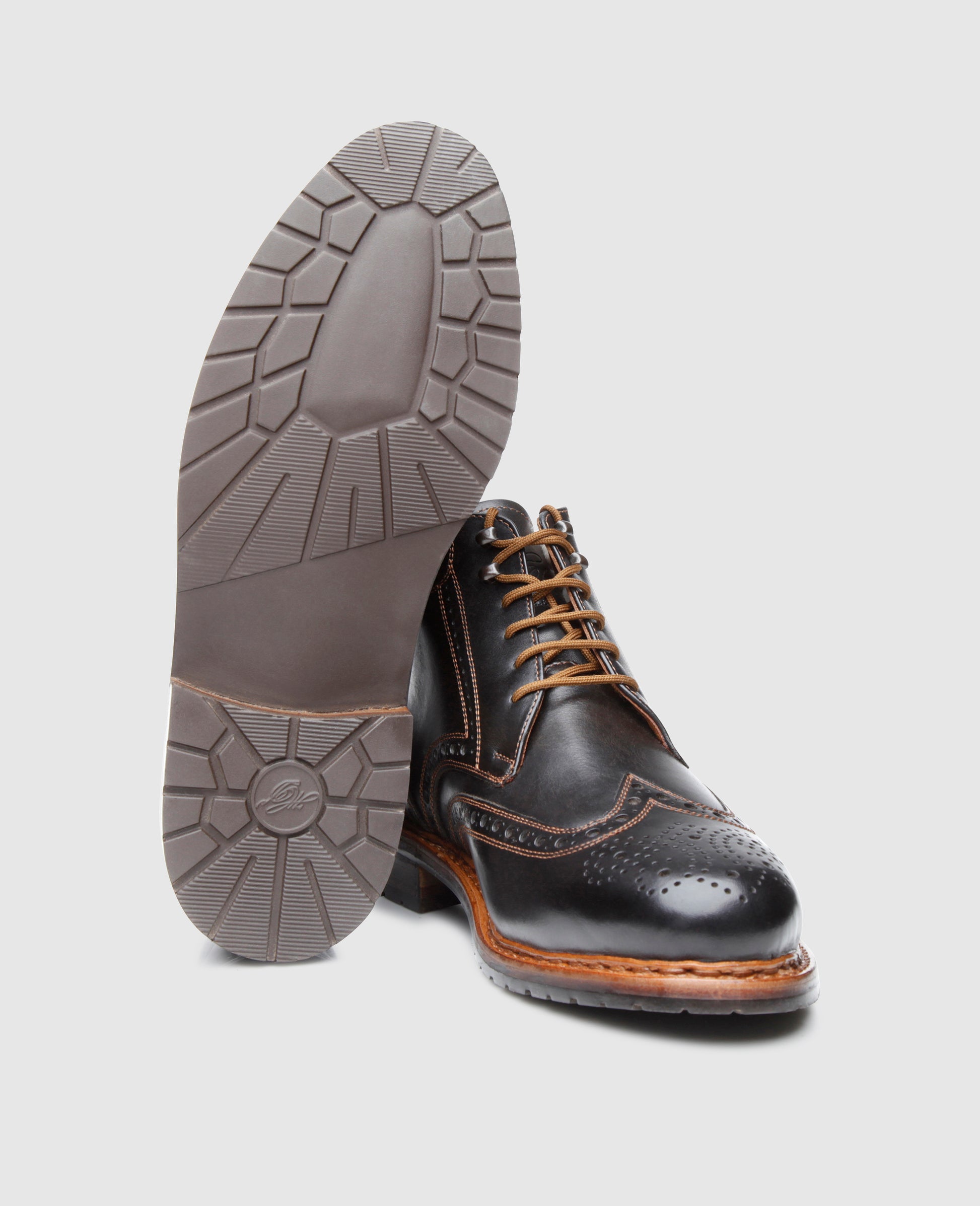 The shaft of this men’s double-stitched, lace-up boot is made from supple Swiss calf. This aniline-dyed calfskin boasts an elegant look, and is also extremely durable and water-resistant. The boot is lined with warming lambskin lining that will keep you feeling toasty, even in the coldest weather. Meanwhile, a fine leather midsole and attached rubber outsole keep you standing firm on slippery surfaces. All in all, this full-brogue boot is a stylish, functional choice for the fall and winter months.