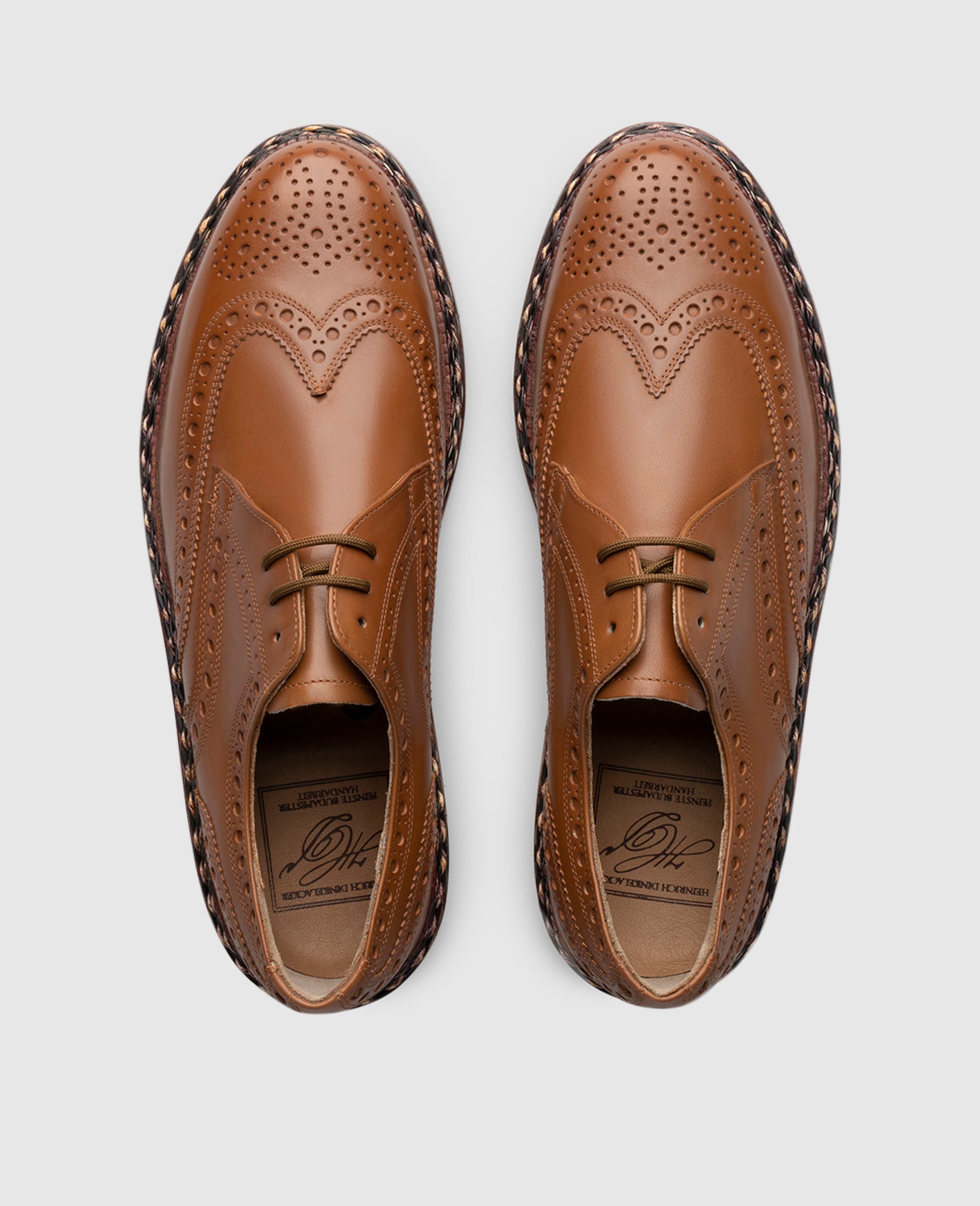 A classic Derby cut gives this full-brogue model a sense of playful nonchalance, as does the detailed Lyra pattern along the heel and toe caps. Sophisticated rosette perforation on the front section rounds out the traditional design.Crafted by master shoemakers in Budapest, the men’s full-leather shoe impresses with its exceptional quality. This aniline-dyed masterpiece is the result of a 300-step manufacturing process. Furthermore, this double stitched full-brogue Derby captivates with its distinctive braided welt, a Heinrich Dinkelacker trademark. It is topped off by a double sole, which is attached with a set of six nails, and which includes a leather Rendenbach outsole.