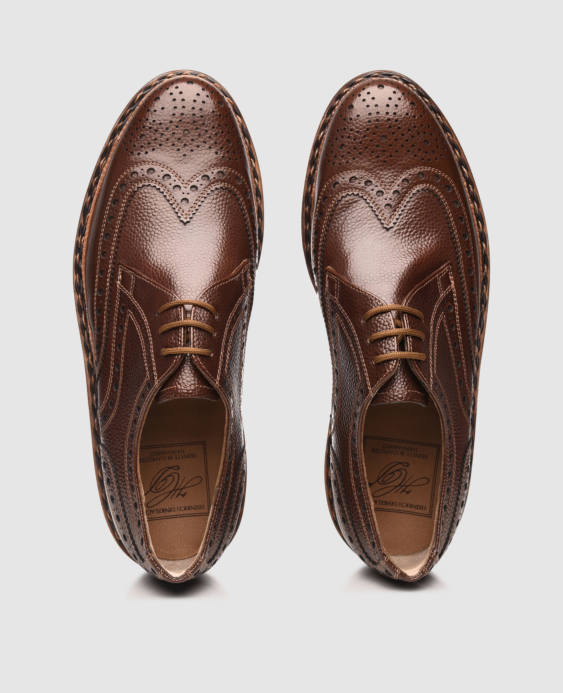 This double-stitched full-brogue Derby for men impresses with a classic cut and open three-eyelet lacing. Embossed calfskin, known as Art Grain, elevates this classic Budapester, making it a modern shoe for many occasions. This model’s brushed upper boasts a striking antique effect as well as a prominent texture.The unmistakable braided welt and meticulous, richly detailed perforation along the shaft are visible testimonies to the unique craftsmanship that goes into each Dinkelacker shoe. It takes our master cobblers over 300 work steps to make each pair in our Budapest factory. As a crowning touch, this model features a leather outsole from the Trier-based Rendenbach tannery, fixed in place with a traditional set of six nails to provide extra stability.