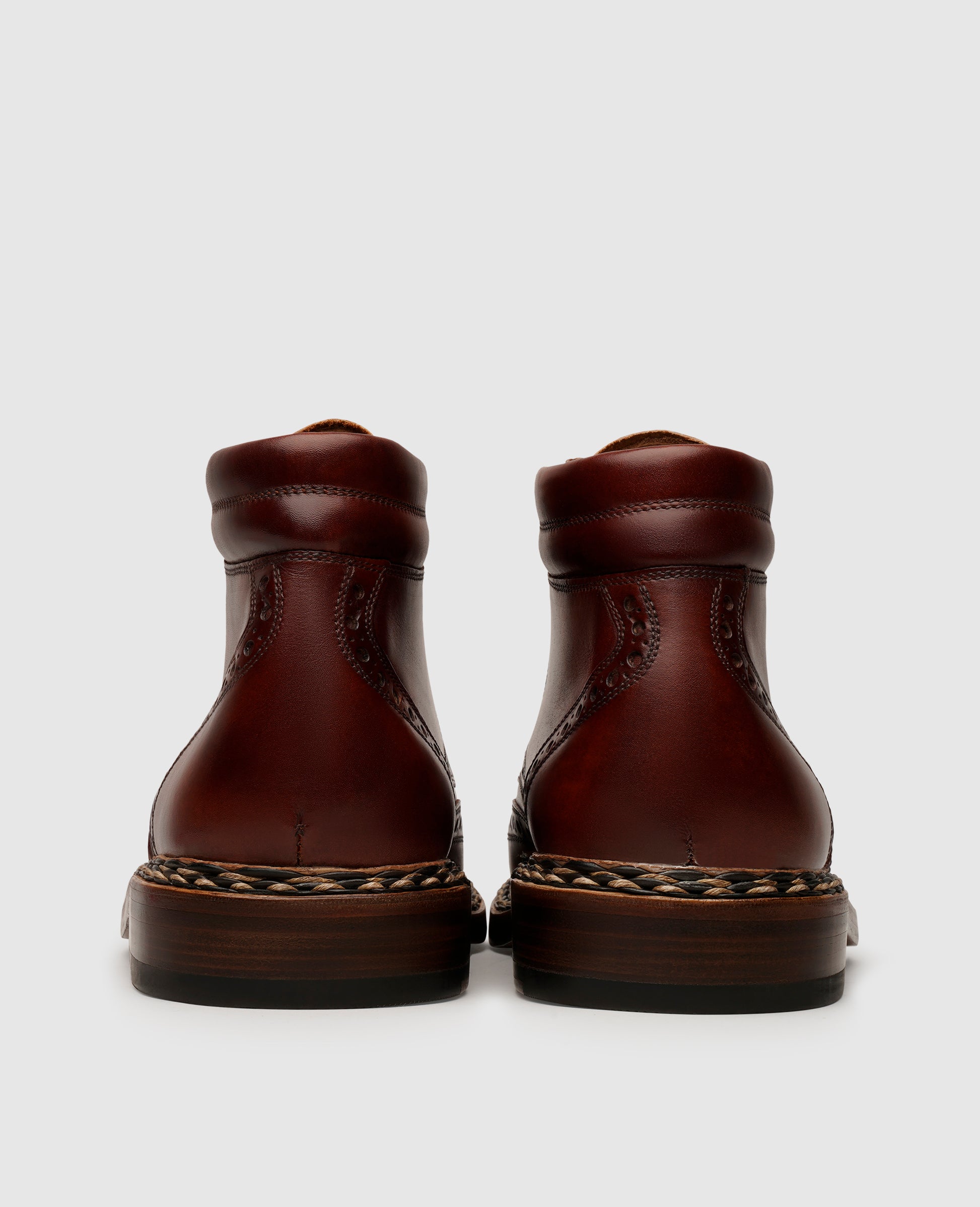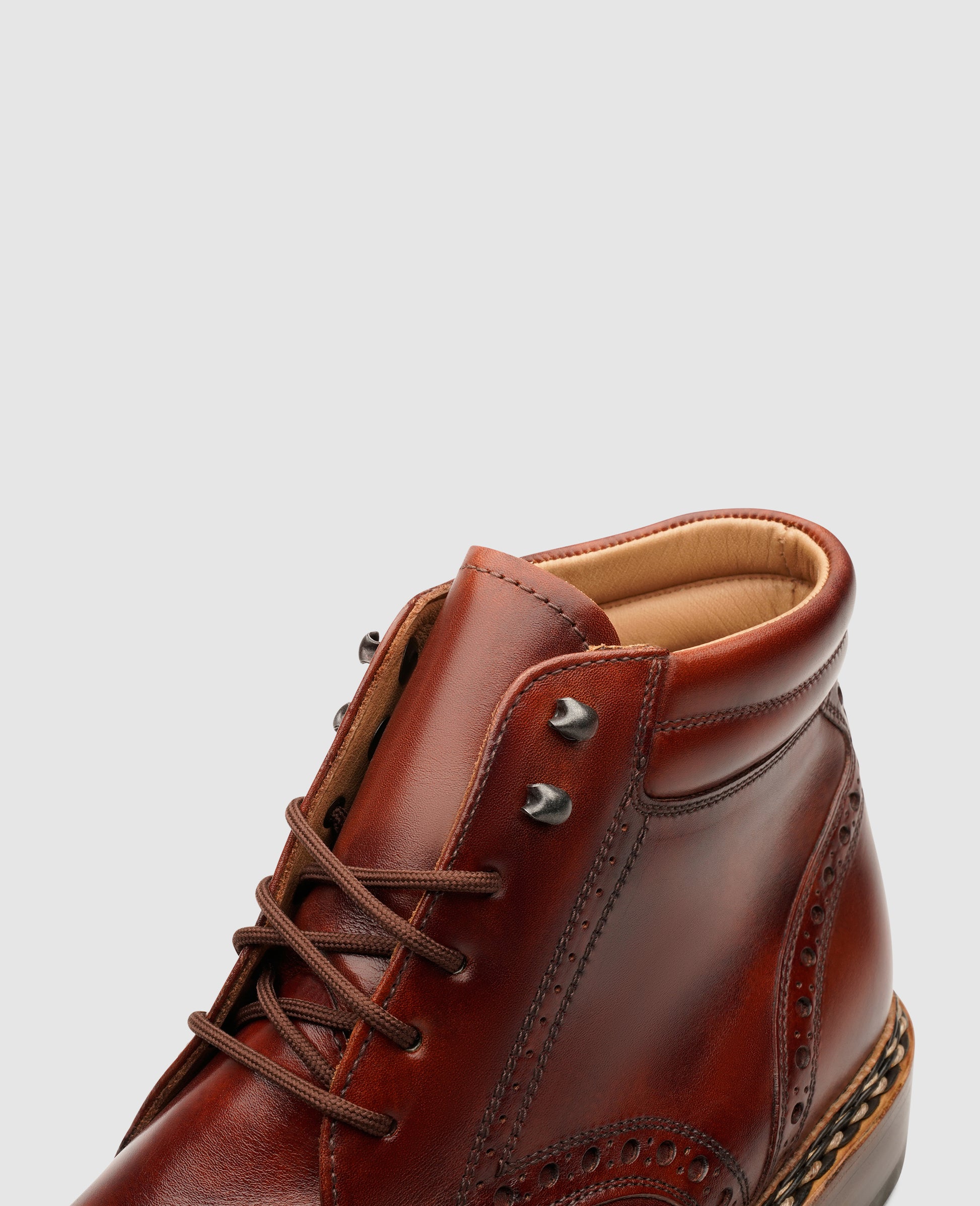 This double-stitched, handcrafted men's boot from our collection combines a graceful silhouette with weatherproof comfort. The shoe's upper delights with its supple, glossy calfskin leather, with its fascinating shades of color, while the decorative lyra perforations add a touch of dynamism. This opulent detailing not only adorns the edges of the upper but can also be seen on the curved toe and heel caps.The intricate construction of the elegant double sole and elaborate set of six nails represent the luxury of the craftsmanship involved. The hand-woven braided welt complements the exceptional comfort offered by this exquisite full-leather shoe and is a testament to the shoemaking mastery of Heinrich Dinkelacker. The spacious last shape offers the average foot the utmost in comfort.