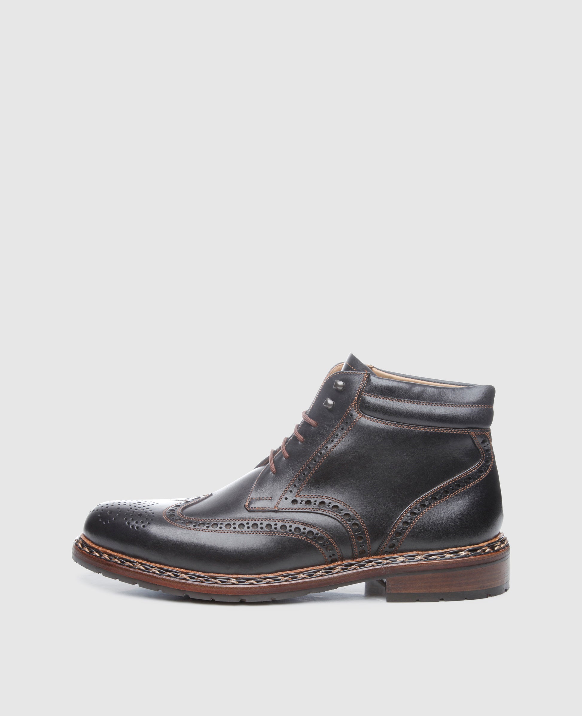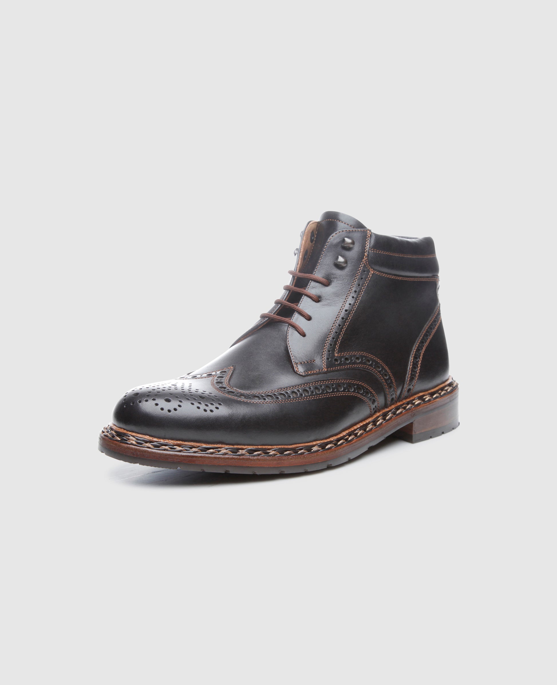Further distinguishing features include open hook-and-eyelet lacing as well as the rubber lug sole attached to the premium leather midsole. Said rubber outsole guarantees reliable traction on slippery surfaces. Meanwhile, the waterproofed, aniline-dyed calfskin from which the upper is made impresses with its durability and water-repellent properties. Thanks to these sophisticated materials and meticulous production, this premium full-brogue boot is the perfect choice for cold, wet weather.