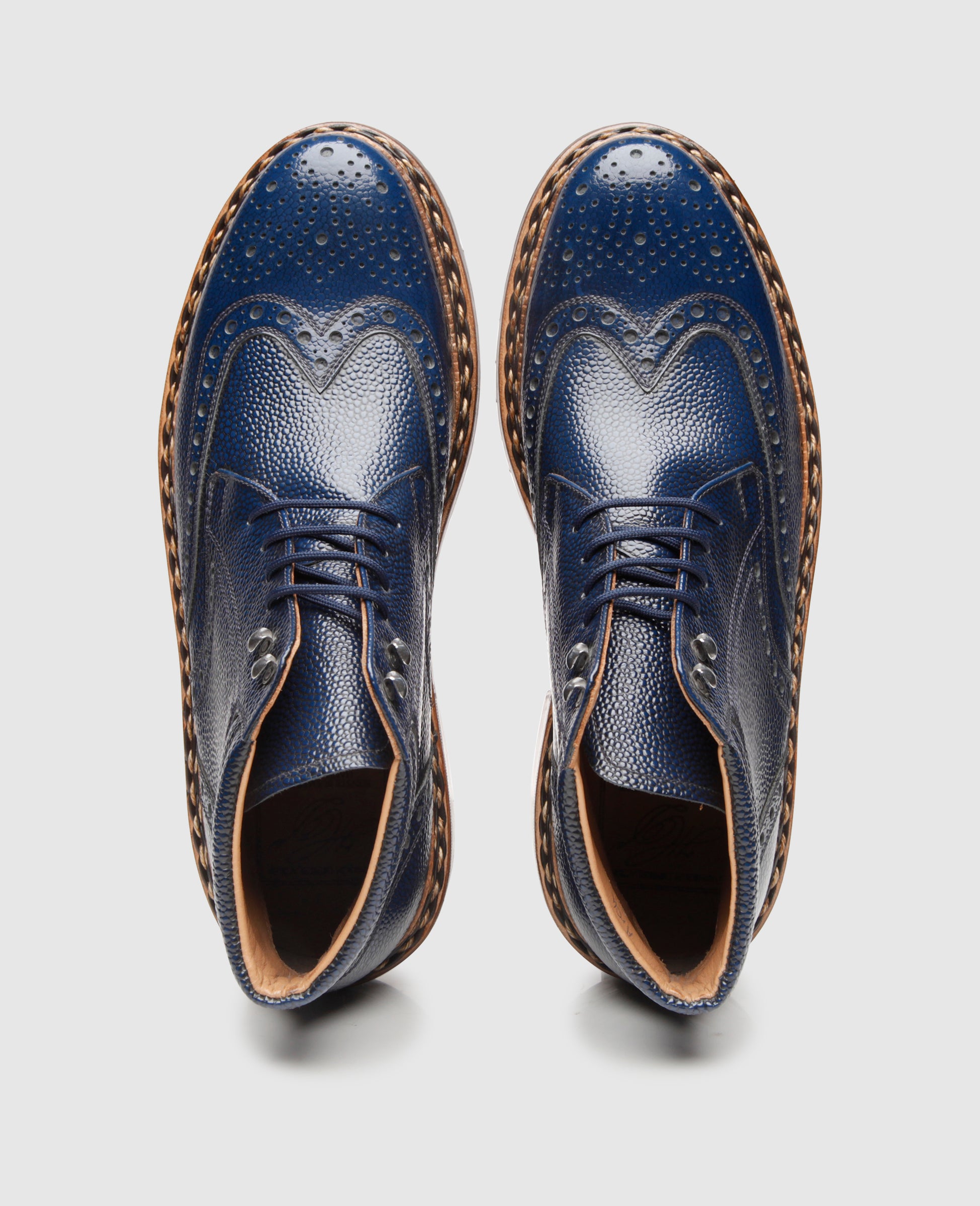 This boot’s dynamic character is evinced by open hook-and-eyelet lacing as well as richly detailed perforation. The meticulously hand-punched broguing and hand-woven braided welt testify to the unmistakable cobbling craftsmanship behind the Heinrich Dinkelacker collection — the pieces in it are rare specimens indeed.