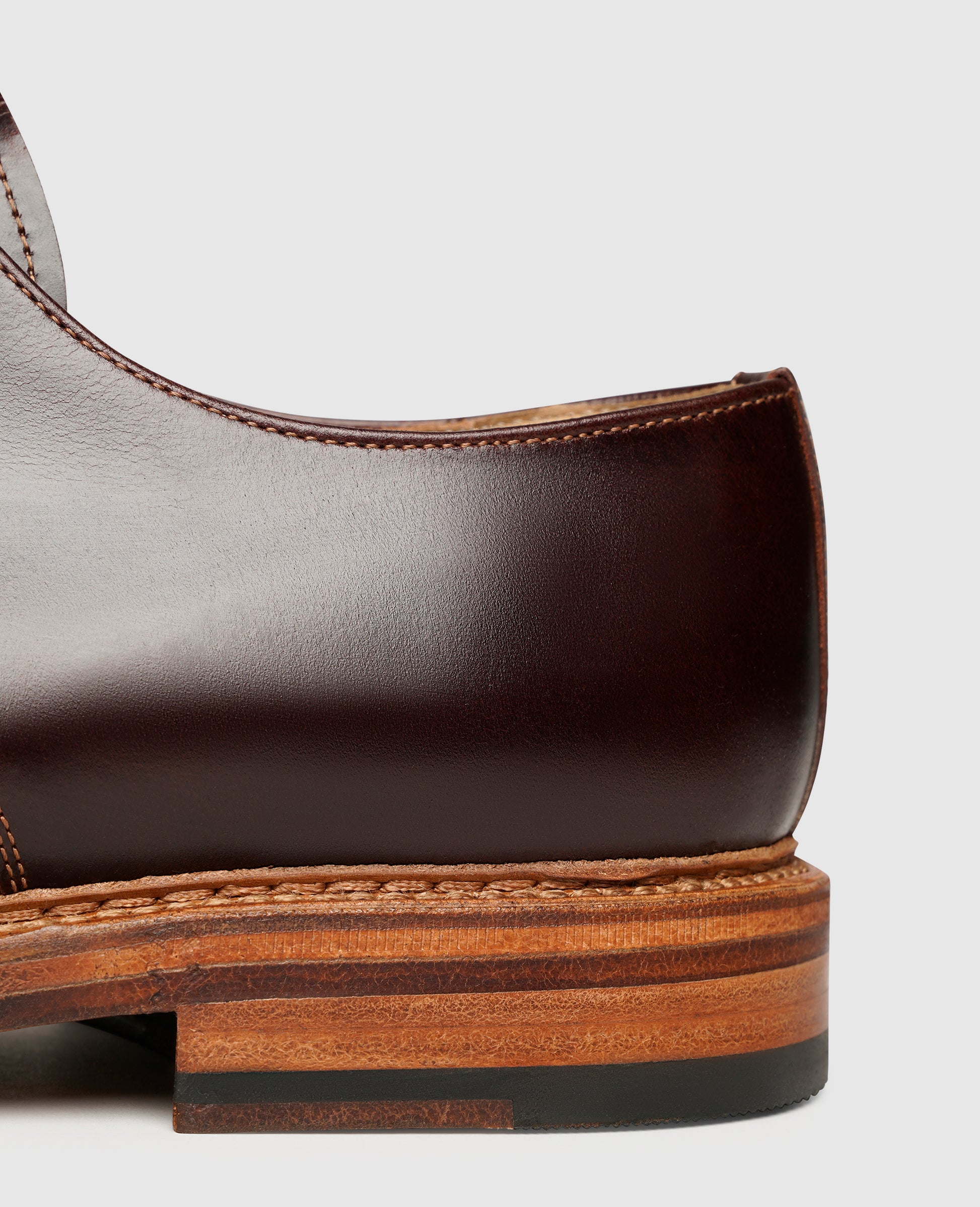 A symbiosis of lightweight comfort and classic elegance is presented by this Goodyear welted plain derby by Heinrich Dinkelacker. Together with a comfortable leather footbed and a vegetable-tanned and breathable leather lining, the shoes, handcrafted in Spain, promise modern ease and comfort. The material of smooth and robust mambo leather in dark brown, combined with a 3-hole lacing, makes this shoe for men exceptional. A noble leather outsole ensures that your feet won't get tired even after a long day. This lace-up shoe will make your casual looks perfect all year round.