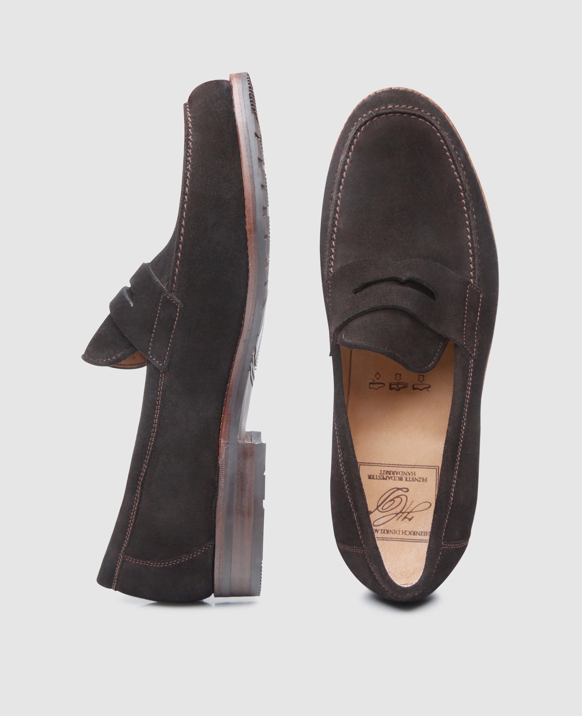 The sporty character of this timeless penny loafer is emphasized by its soft calfskin velour leather. Once worn by students of the elite American universities, this shoe has long since established itself as a staple in the leisurewear and office wardrobes of style-conscious men. The characteristic vamp insert and the traditional instep bridge with the window-like recess pay tribute to the classic.