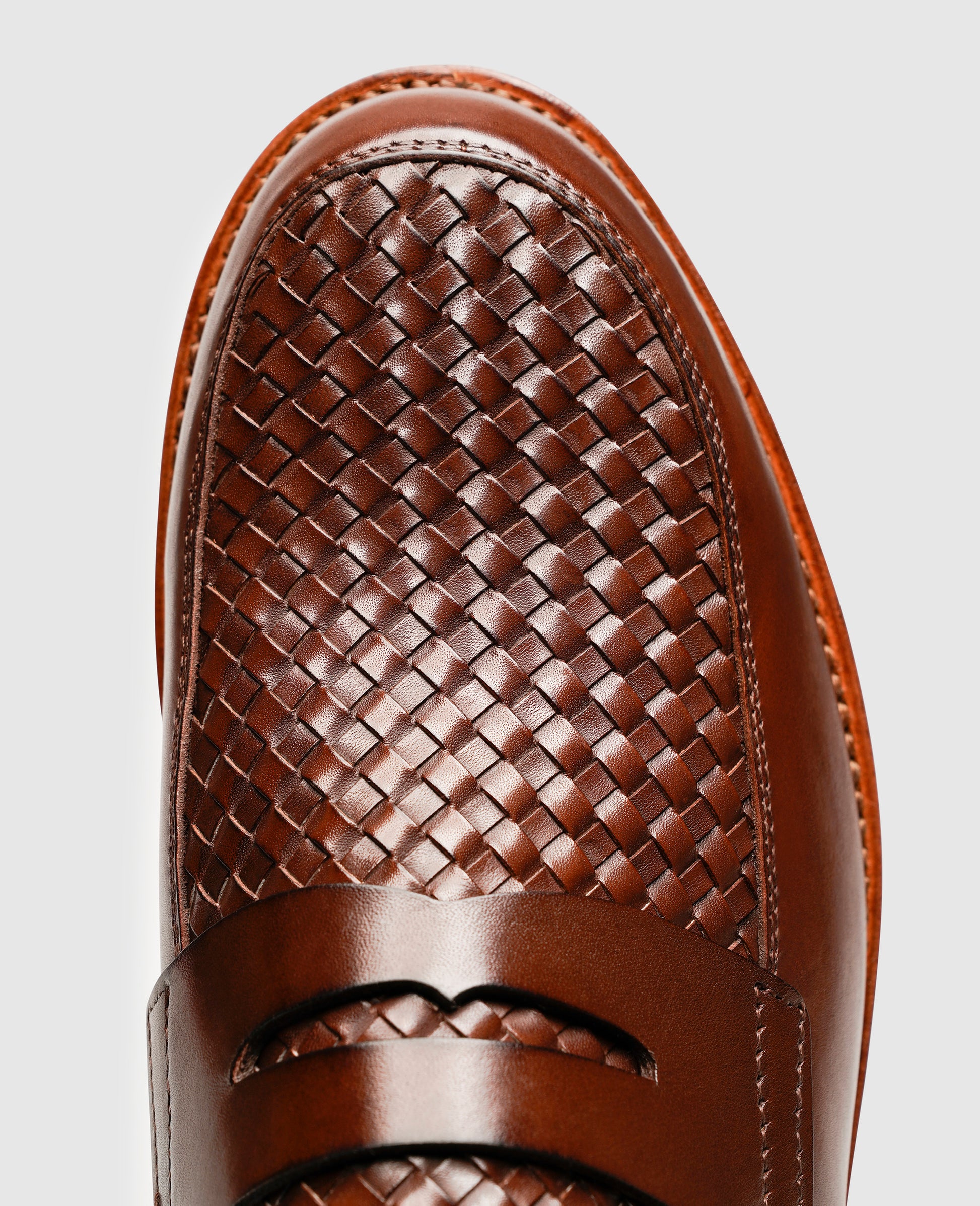Summery lightness is ensured with this Goodyear-welted, handcrafted Penny Loafer for men from Heinrich Dinkelacker. In keeping with the tradition of this famous slip-on shoe, it features a distinctive vamp insert and striking leather strap with a window-like cutout on the instep. Graceful dynamism is provided by the striking combination of supple, glossy smooth leather and woven leather sections. On the inside, a vegetable-tanned lining promises a comfortable wear – even without socks. The durable Rendenbach leather sole guarantees the highest levels of comfort as well as an elegant look.