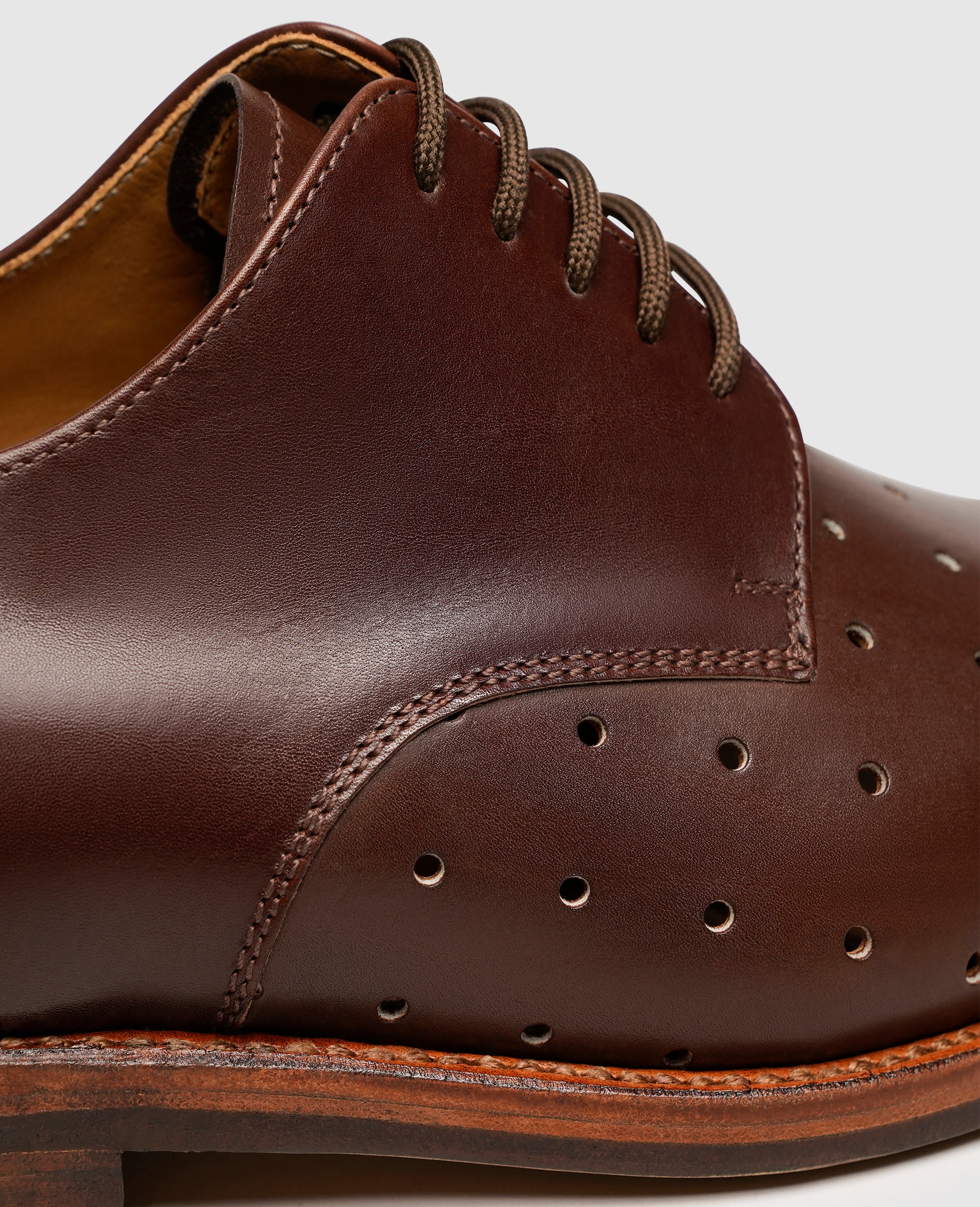 This Goodyear-welted, handcrafted classic with its comfortable Derby lacing exudes a summery flair. The exquisite Toscana Calf of the upper, with its elaborate brushed hand finish, offers a dynamic grace while the eye-catching perforation detailing on the vamp, which passes through both the upper and inner leathers, adds a certain nonchalance to the model. In addition to its visual appeal, the perforated leather upper also ensures air is able to circulate comfortably within the shoe, even in summer temperatures. The durable Rendenbach leather double sole and hard-wearing triple nailing complete the comfort of this exclusive full leather shoe for men to perfection.