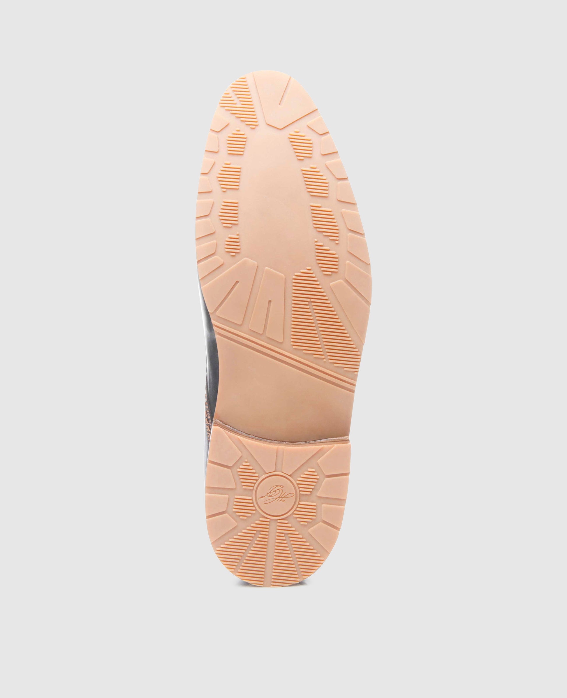 This plain Derby has a modern touch, too: the stylish Luzern last, which boasts an average width. Moreover it also boasts a light outsole, a comfortable double leather sole combined with a rubber lug profile — this makes for a lovely contrast against the dark-coloured upper portion of the shoe.