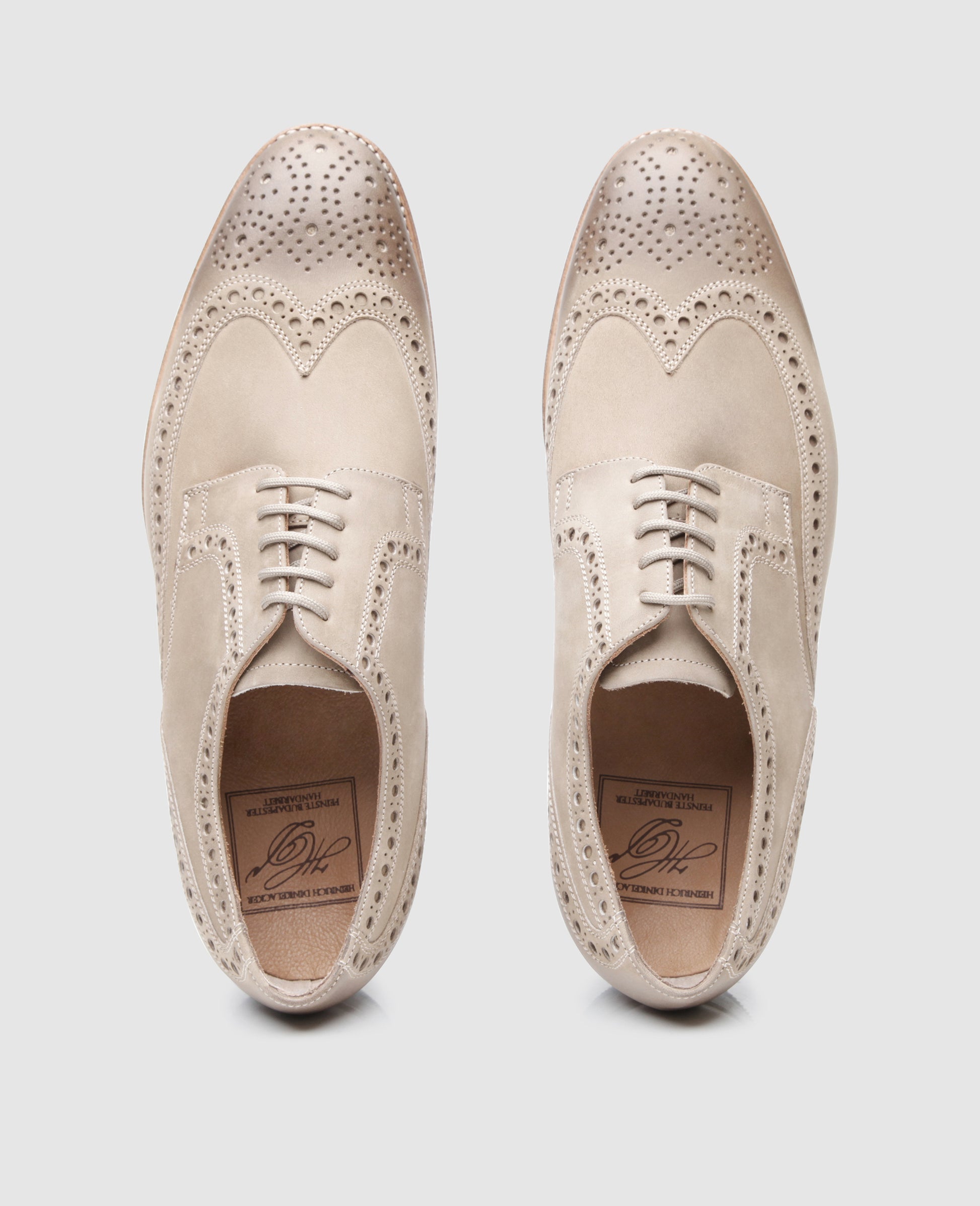 A lively, dynamic feel is made manifest in the form of this sewn-welted, full-brogue Derby. Its multi-part basic shaft cut is accompanied by lavish Lyra perforation, which receives a crowning touch through the lovely ornamentation at the toe cap. Made from soft nubuck and featuring open lacing, this beloved, classic shoe exudes a stylish flair.Our cobblers’ many years of experience, perfect sense of proportion, and meticulous craftsmanship result in the unique fit of each pair of Dinkelacker shoes made in our Budapest factory. A classic Luzern last and flexible double sole ensure this sophisticated leather shoe’s high level of quality.