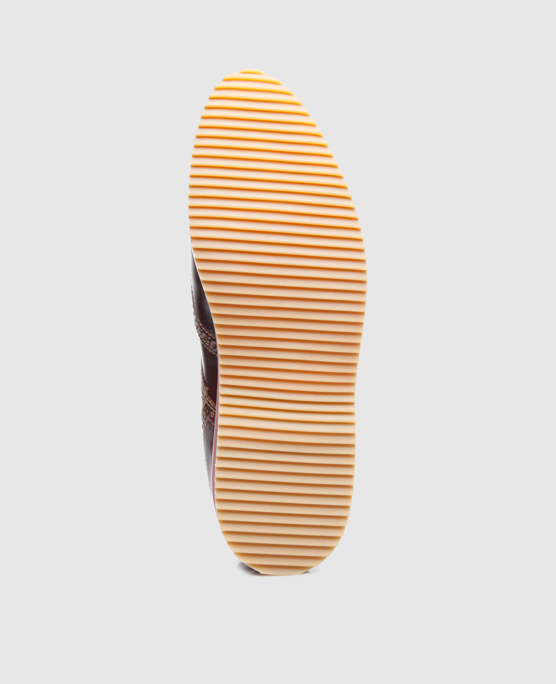 The supple, gleaming oxblood shell cordovan from which the upper is made also underscores the traditional elegance of this classic British shoe. This model boasts a light and modern feel, though, thanks to its multi-coloured wedge sole and the gently tapering Campus last that was used in its assembly.
