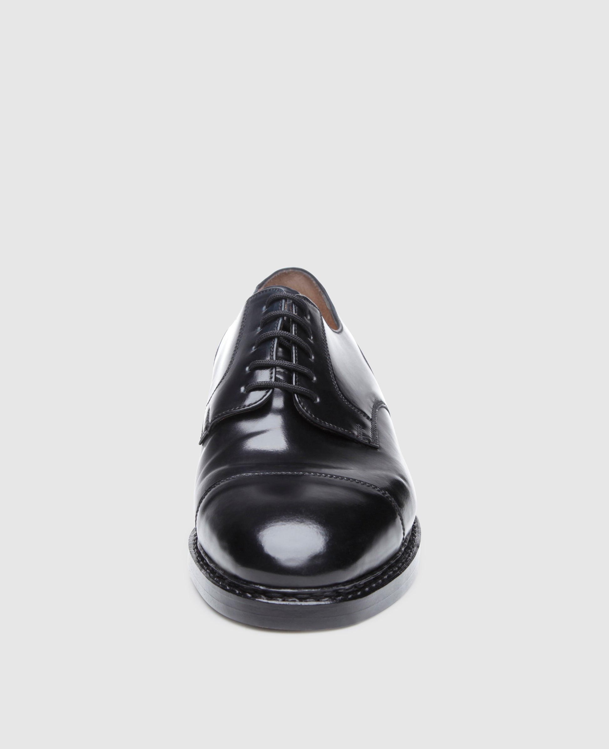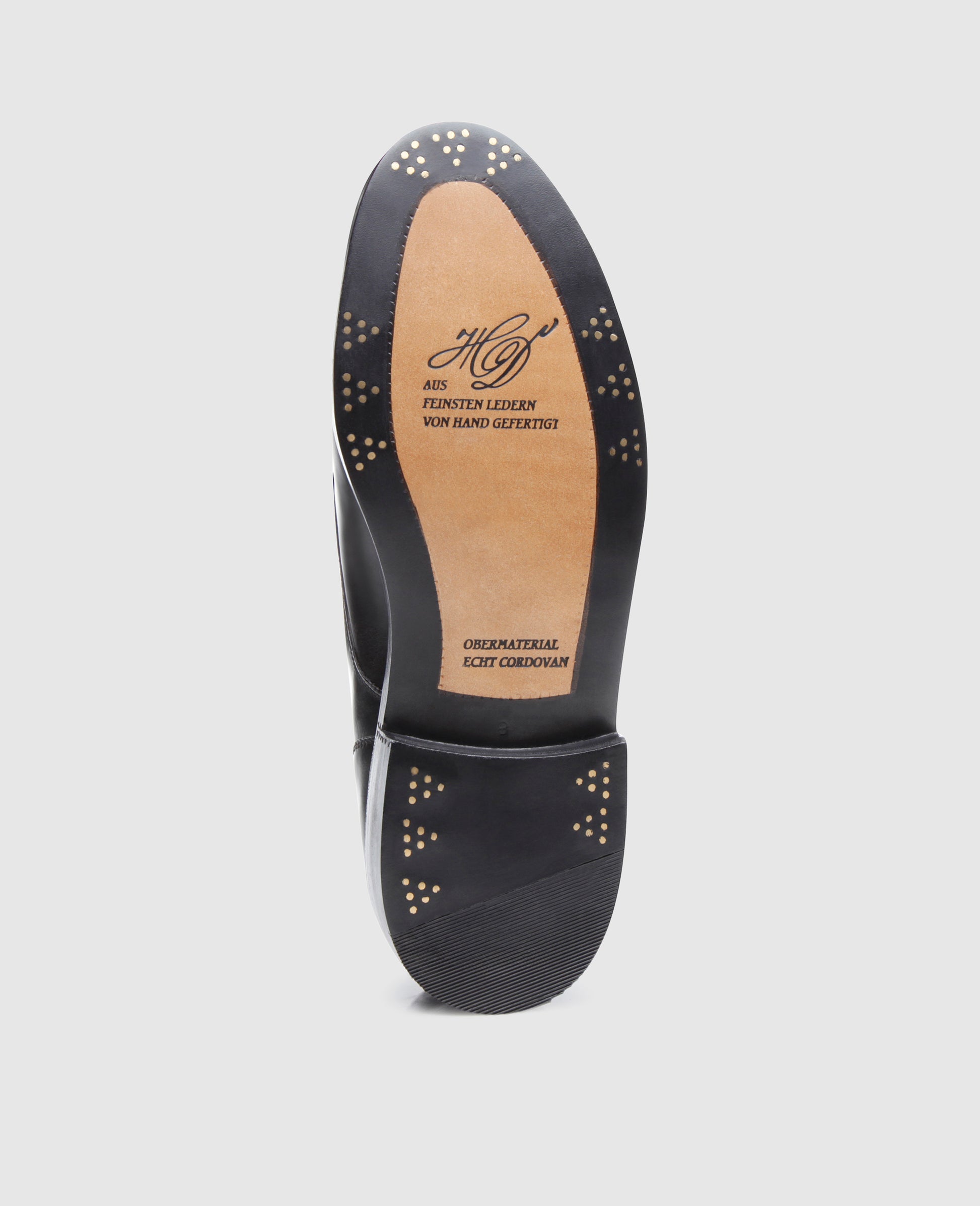 A luxurious shoe for business events and festive occasions: Presenting the double-stitched, handcrafted cap-toe Derby with open five-eyelet lacing. Its upper is made from exclusive shell cordovan sourced from Chicago’s Horween tannery.This famous equine leather is virtually indestructible and barely develops creases from wear — even the smallest scratches on its surface can be simply polished away. Moreover, shell cordovan is very easy to care for. Thanks to its high natural fat content, it effortlessly maintains a glassy, mirrored look and a smooth and supple feel.Of equally high quality is the shoe’s processed leather outsole, made using materials from the traditional Trier-based Rendenbach tannery, and fixed in place with a meticulously arranged set of six nails. Since this shoe has been assembled using a generous London last, it is pleasantly rounded at the front of the foot, ensuring the utmost degree of wearing comfort, even for gentlemen with wider-than-average feet.
