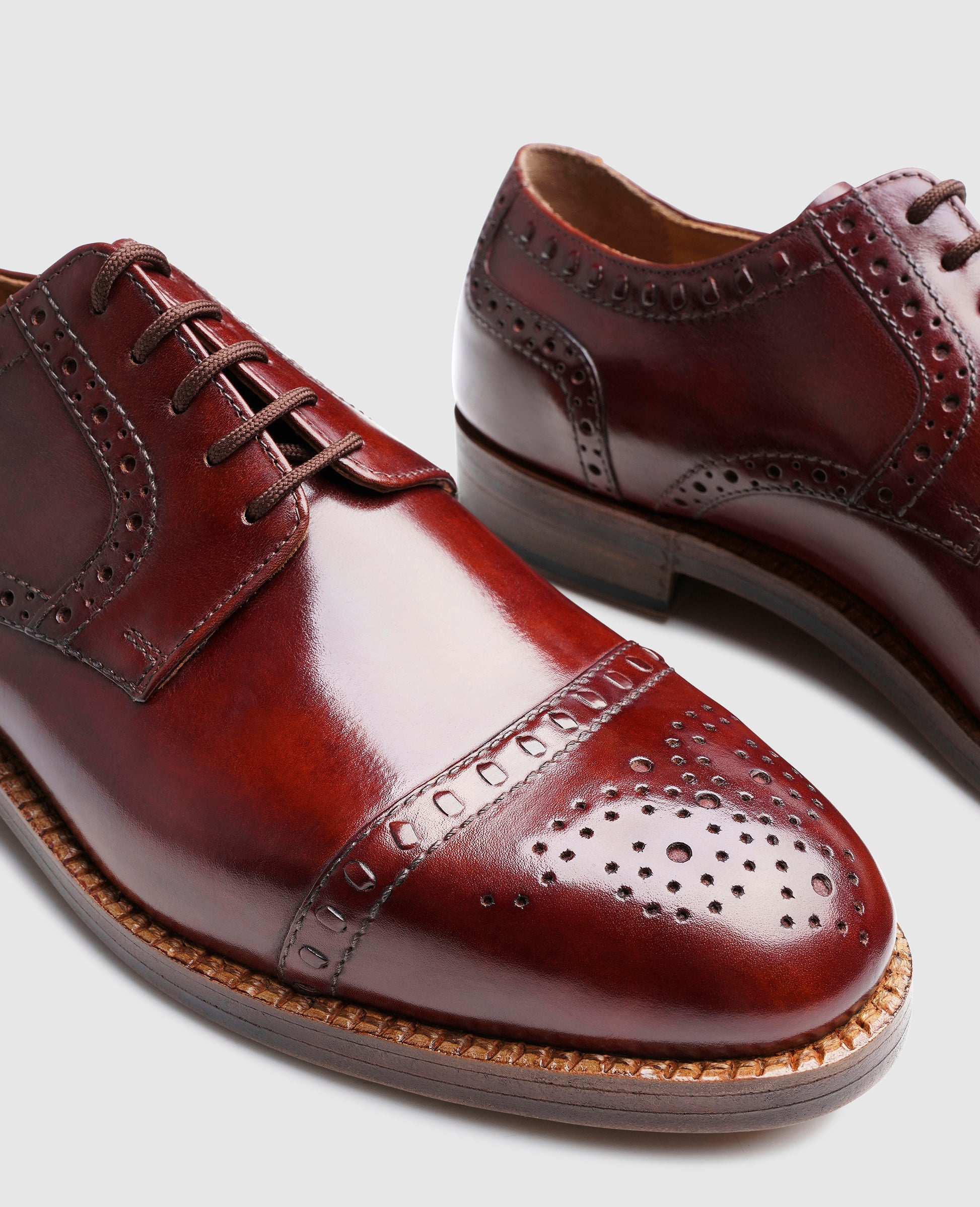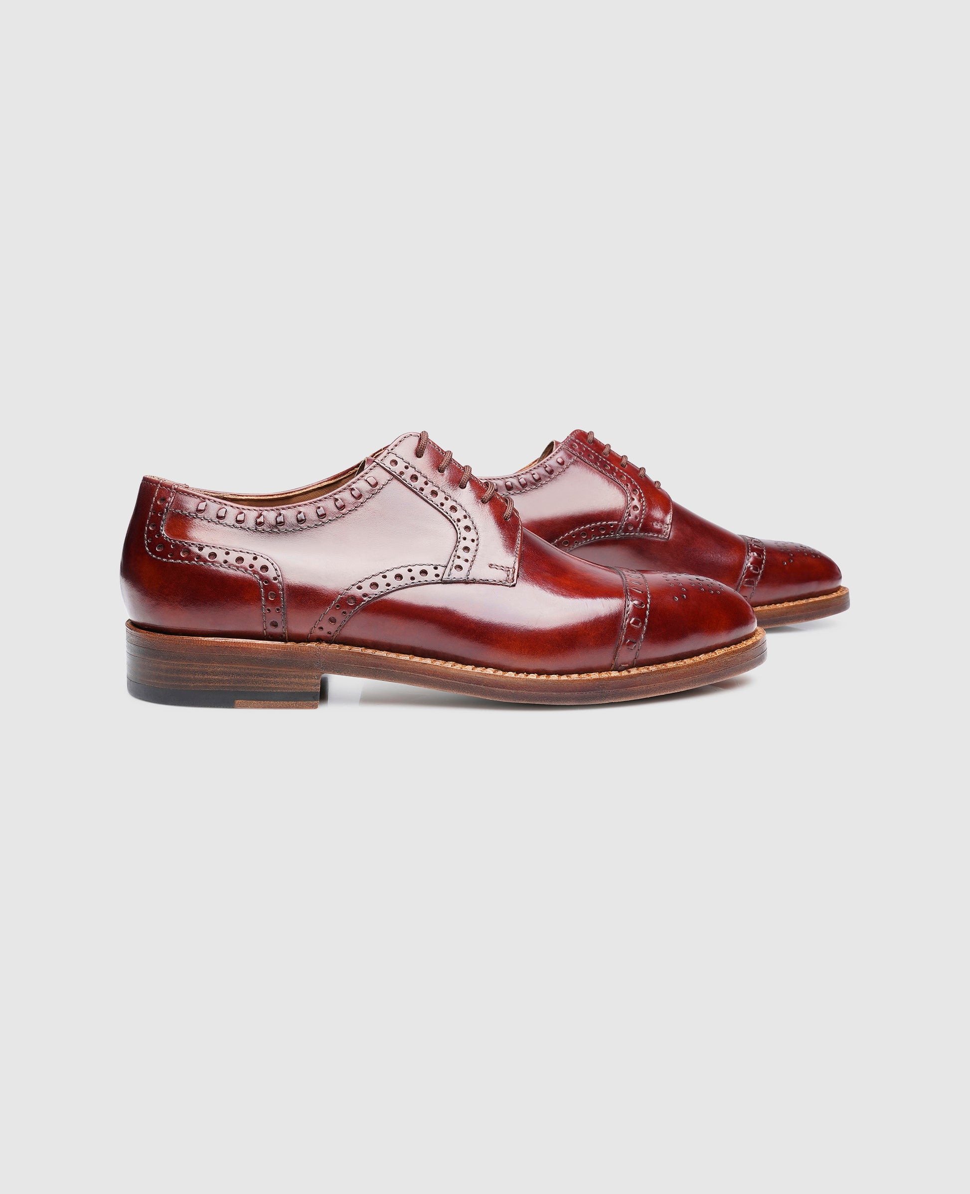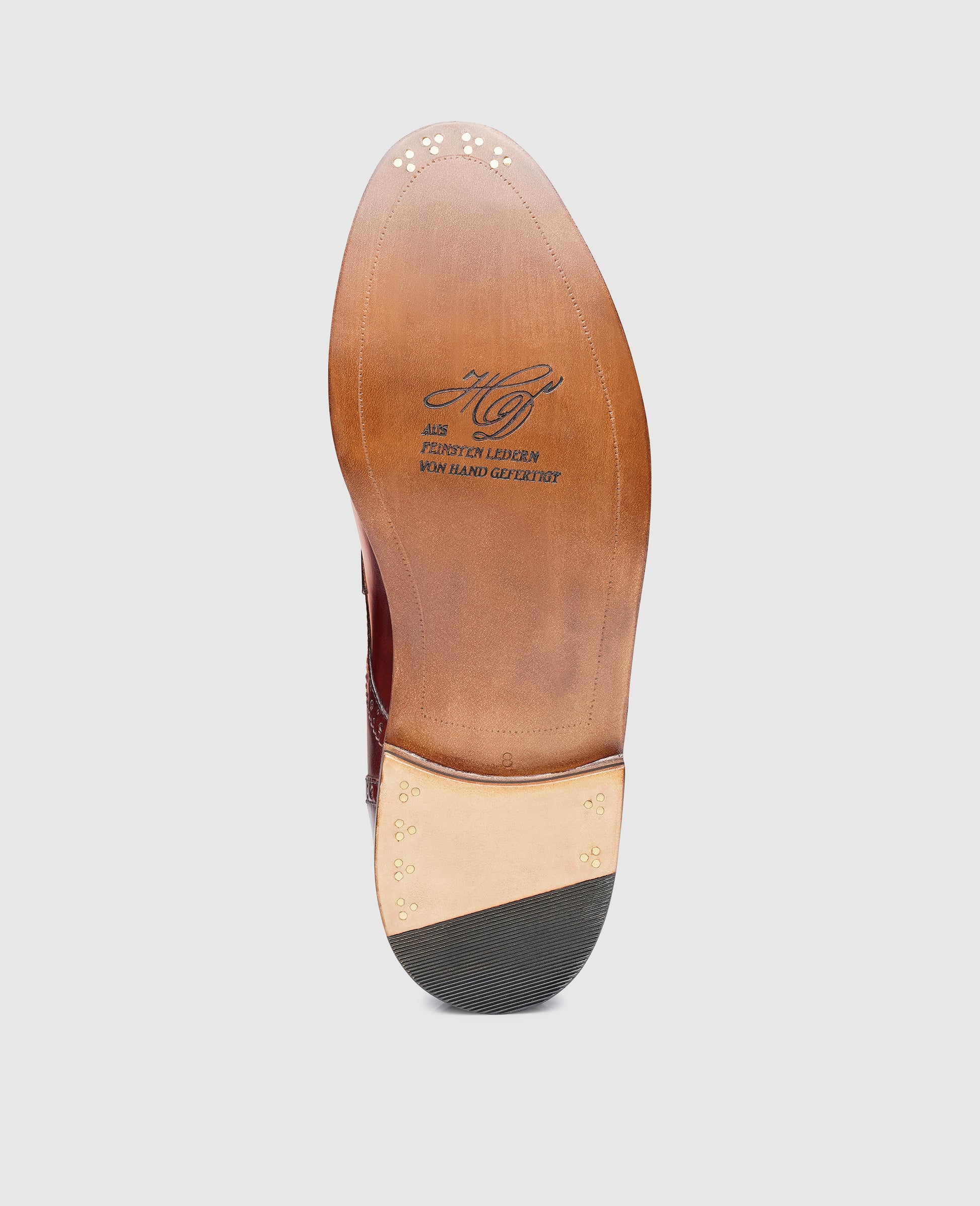 This classic men's shoe model with its characteristic open lacing knows how to impress with its supple, glossy Tuscan Calf leather upper, which features an extraordinary hand finish. For the outsole, the attention to detail poured into the traditional double sole with its set of three nails guarantees the maximum in both comfort and longevity. The sophisticated interplay of traditional design, exquisite full-grain leather and incomparable shoemaking craftsmanship elevates this half-brogue Derby from our collection into an extremely versatile choice for men who value quality, style, and sustainability.