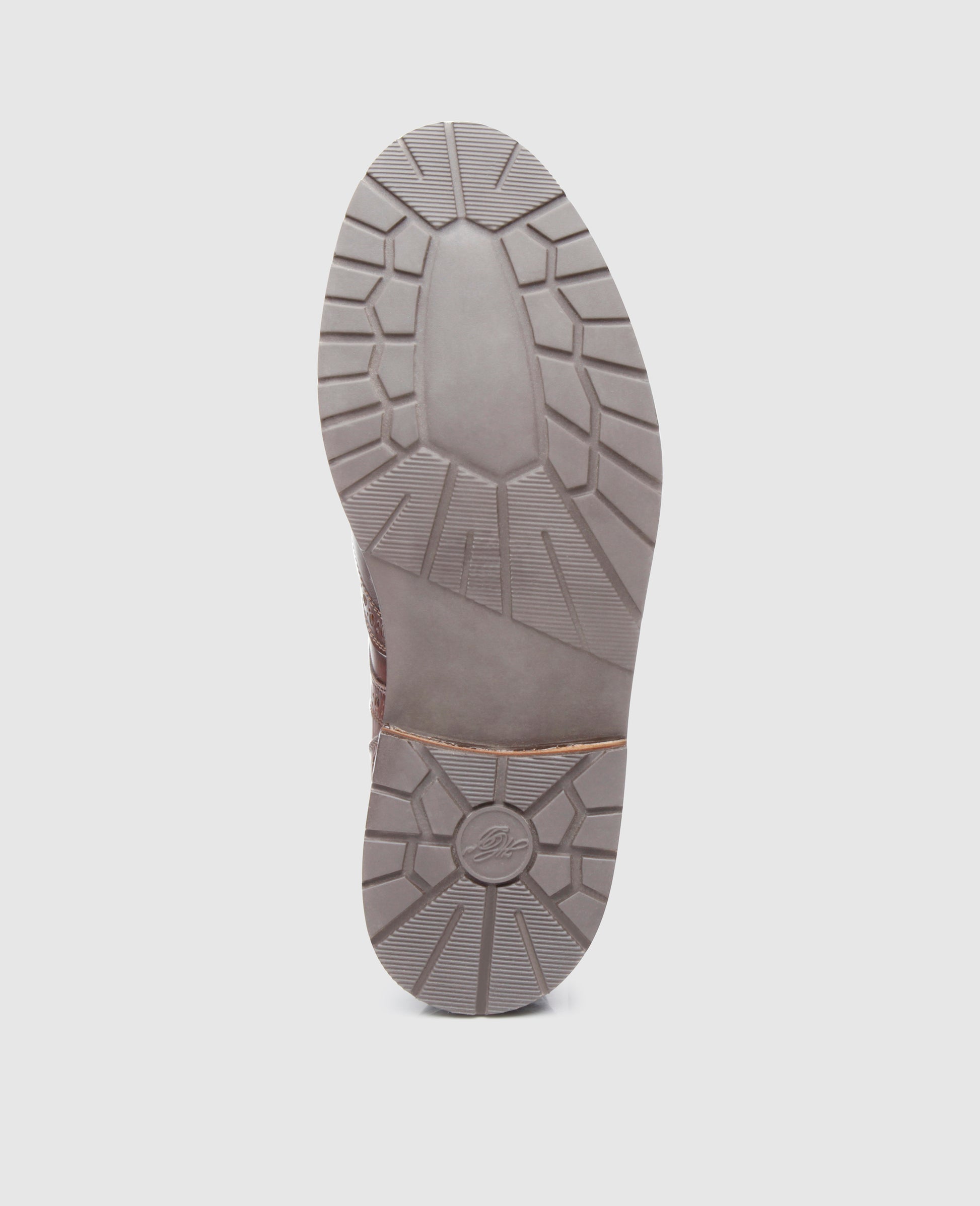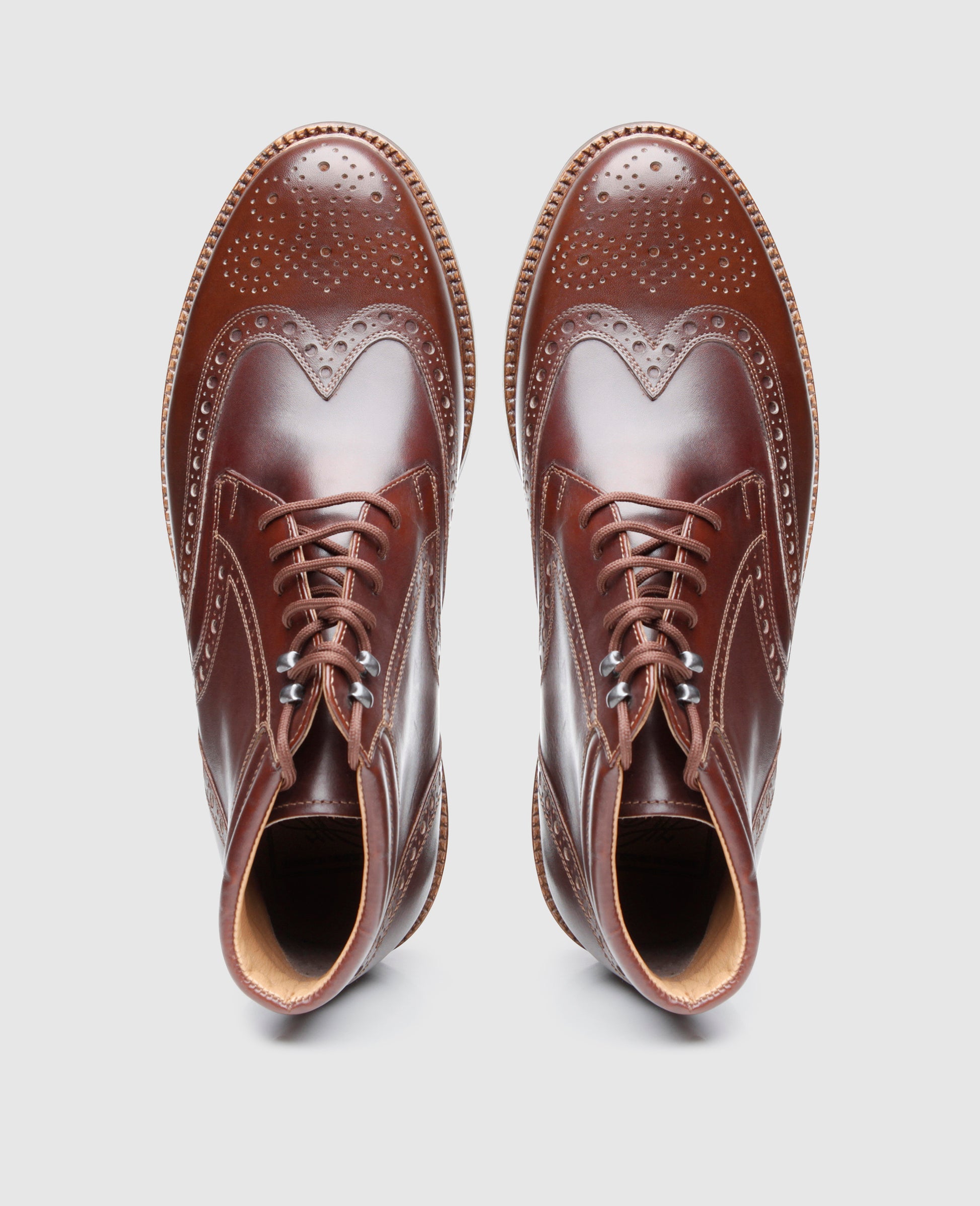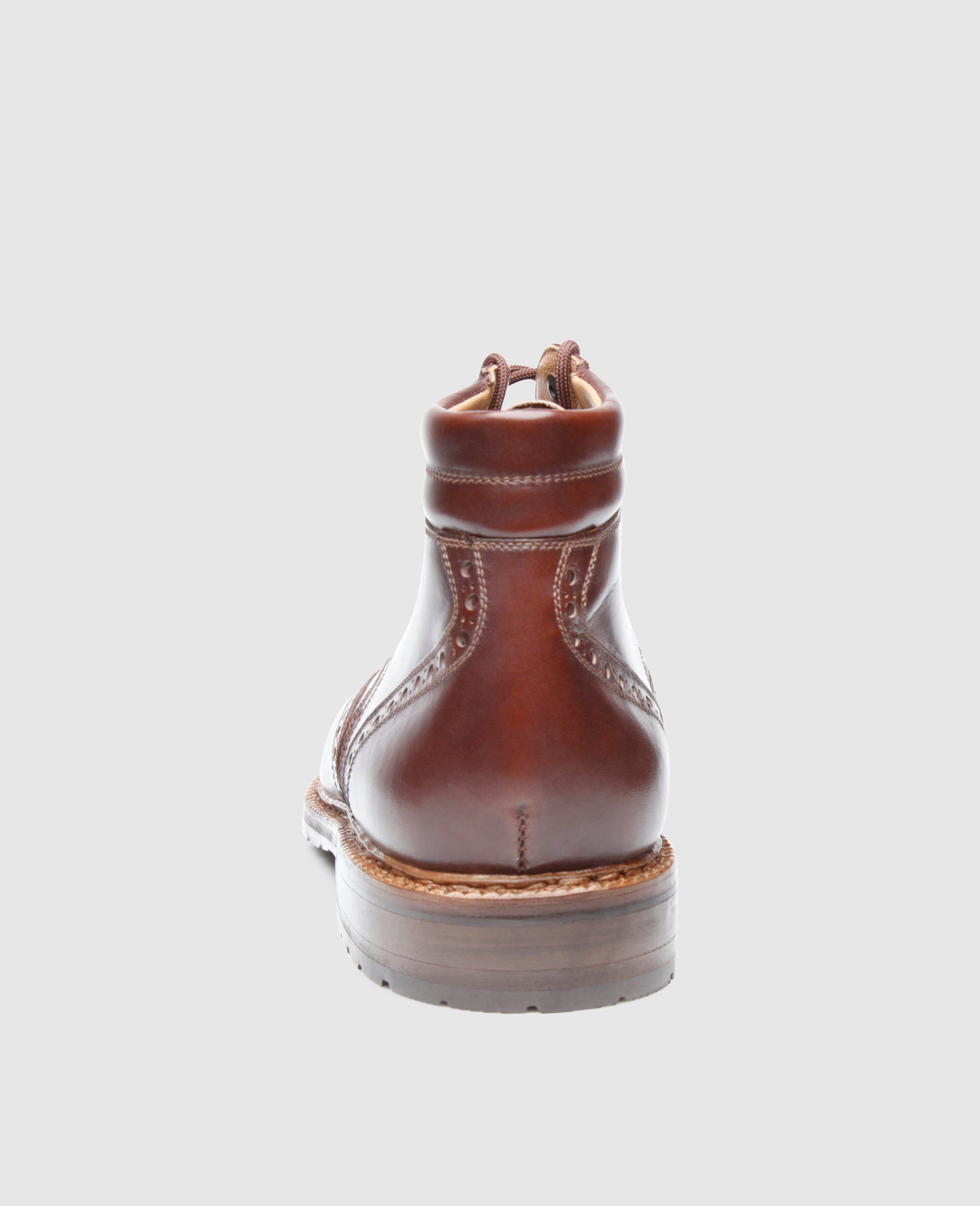 This men’s boot combines athletic design with stylish nonchalance. Its meticulous Lyra perforation serves an impressive testament to the lovingly detailed craftsmanship practiced by our master cobblers in Budapest. Assembled around the extra-wide Janosh K last, this boot is pleasantly lightweight and entirely fulfills discerning shoe lovers’ requirements.The cut of this double-stitched Derby boot exudes a dynamic flair, underscored by the rubber sole and open hook-and-eyelet lacing. At the same time, the gleaming, aniline-dyed calfskin of the shaft coupled with meticulous decorations creates an elegant look. The hook-and-eyelet closures at the upper end of the shaft and the reinforcements at the ankle-height portion of the shaft make this boot easy to put on and ensure that it rests comfortably and firmly against your foot.