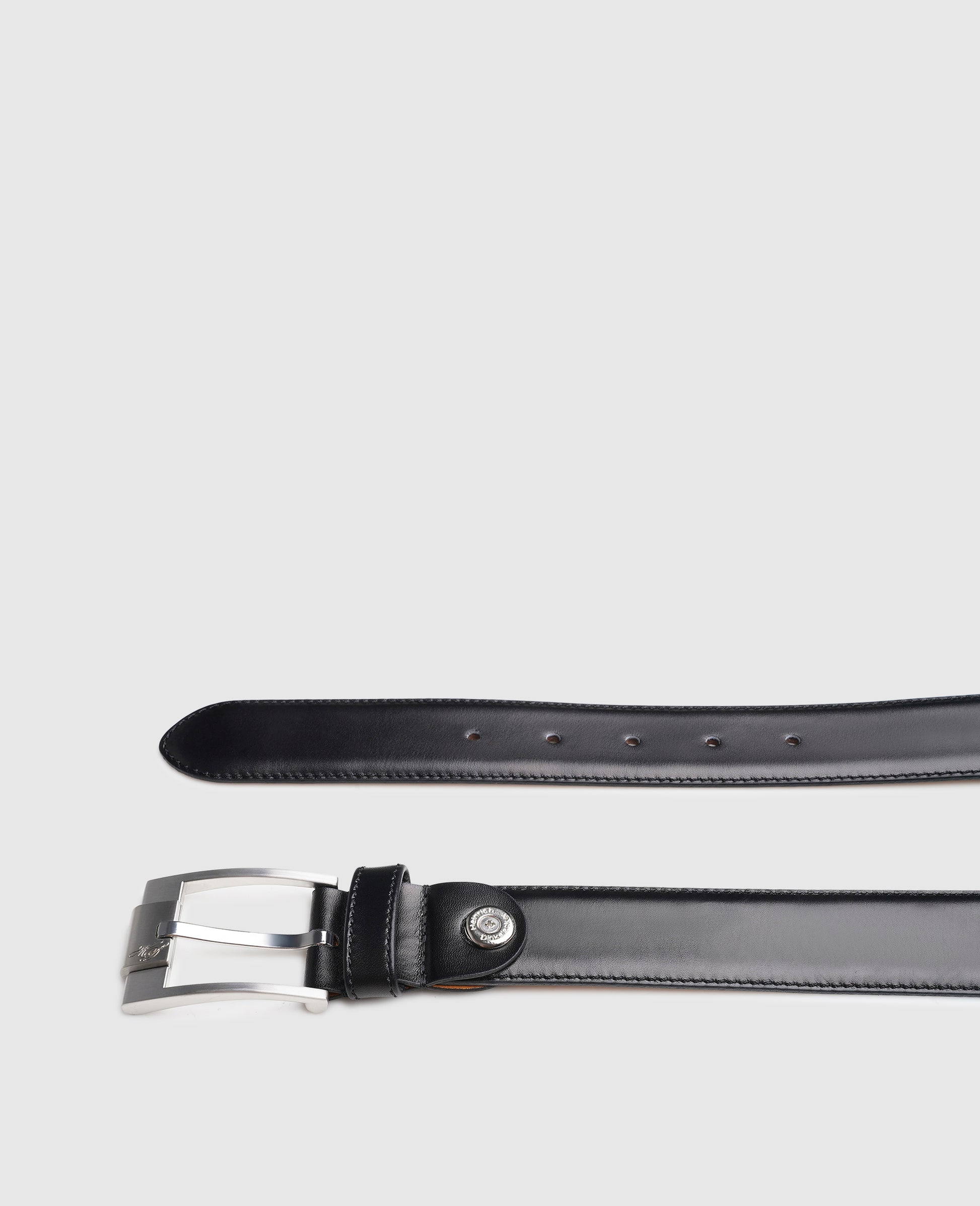 This 35 mm wide, stitched, full-leather belt is the ideal choice to combine with an elegant men’s shoe made from the finest box calf leather; with its classic design making it the perfect accompaniment for formal occasions. While the outside shows off the famous calfskin leather, the inside is made of premium cowhide. The two leather layers are stitched tightly together and the look is finished off with a silver belt buckle made from zamak.