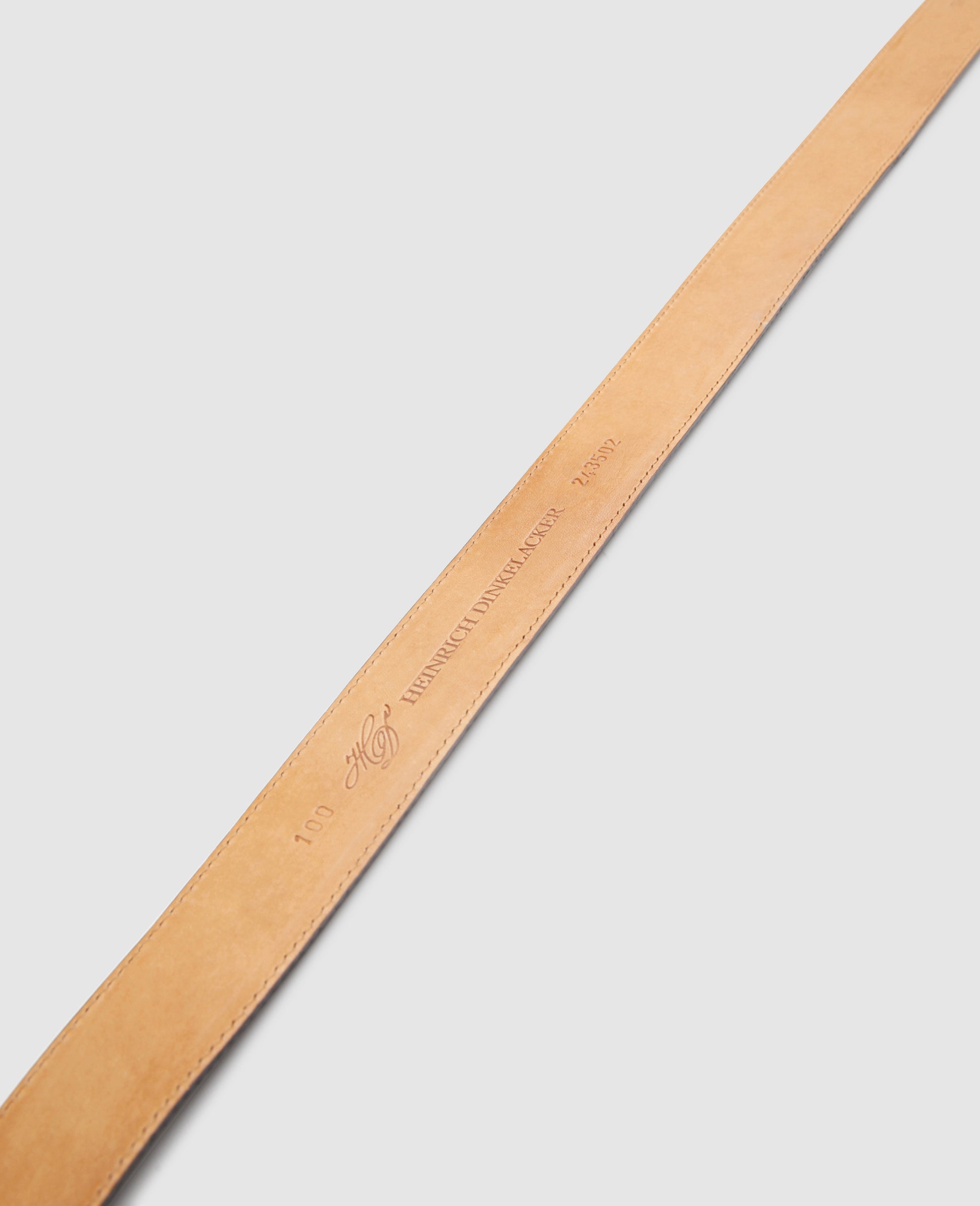 This handmade full-leather belt for men is as sophisticated as the Dinkelacker shoes made of luxurious shell cordovan. While its outside features the famous Horween horse leather from Chicago, its inside is made of exquisite, premium cowhide. The two leather sections, both 35 mm wide, are stitched tightly together in an Italian factory.The tasteful appearance is complemented by a silver belt buckle made from zamak, boasting the Heinrich Dinkelacker emblem. An exquisite accessory for a sophisticated combination.