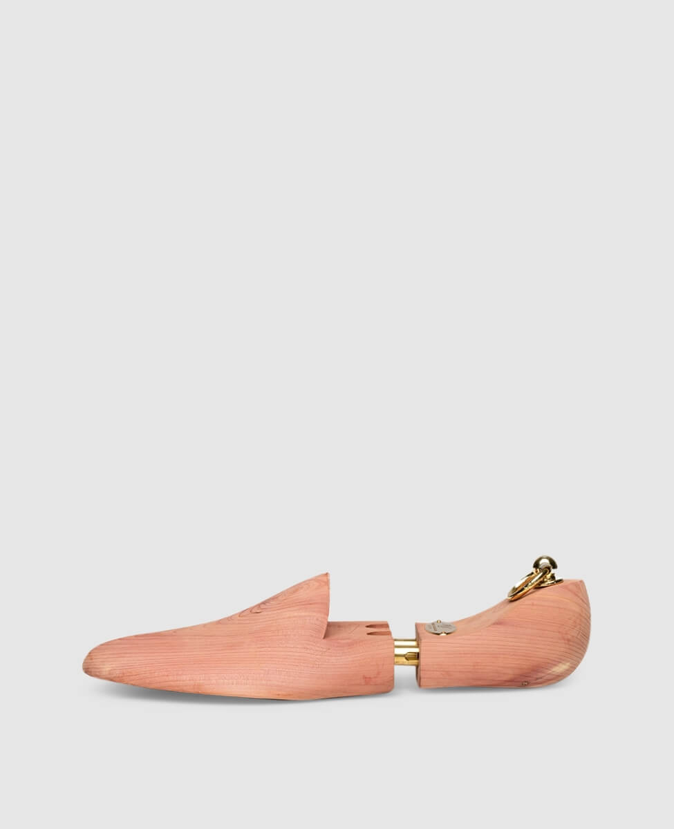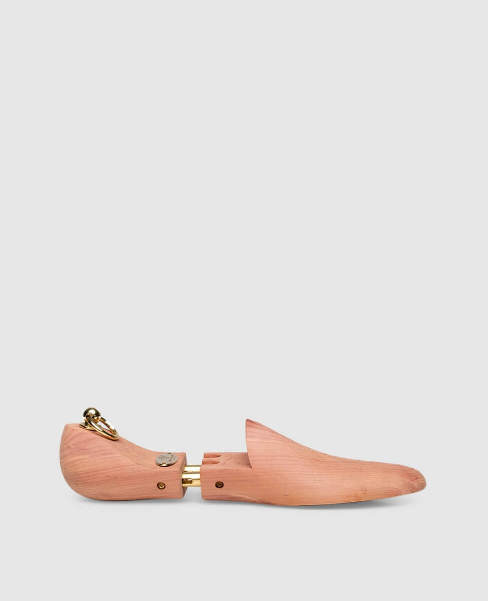 For a long shoe life: This premium, full shoe tree for men's shoes from Heinrich Dinkelacker is made of high-quality cedar wood. It maintains the fit of the shoe and wicks away moisture, thus preventing unpleasant odors from developing. Without a full shoe tree, leather can contract during drying and lose its original shape. A top-end shoe tree with a decorative brass badge!For a perfect fitting shoe tree, choose one size smaller than your shoe size. Therefore, a size 8 tree will usually fit a size 9 shoe. For models created on the Luzern or Janosh K lasts, please choose the same size as your shoe.The red cedar is a high-quality natural product. For this reason, your shoe trees may exhibit signs of small holes in the worked wood during the drying phase, or even cracks. The same applies to a light white coating on the wood. Should this occur, there is no need to worry. The wood gets its wonderful scent from the essential oil thujaplicin, which crystallizes and is then sometimes released. You can remove the crystals without problem using a cloth or very fine sandpaper.